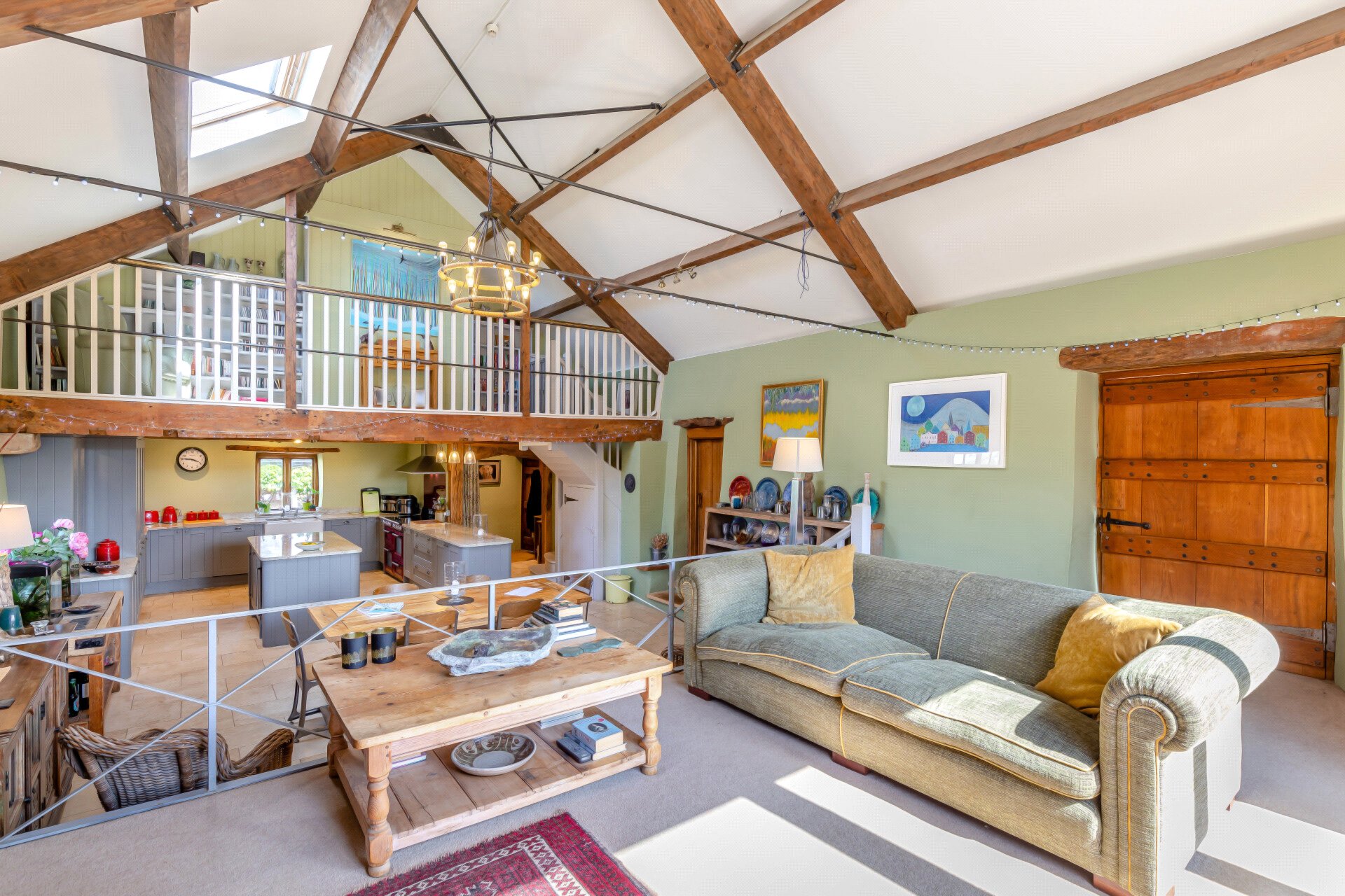 The main house is a beautiful Grade II listed home that perfectly blends style, character and charm. Its historic fabric is evident throughout, yet the property has been thoughtfully enhanced to meet the needs of modern living. At its heart lies a stunning open-plan kitchen, dining and family room, with a vaulted ceiling, oak-framed doors and windows opening to the gardens and views beyond.