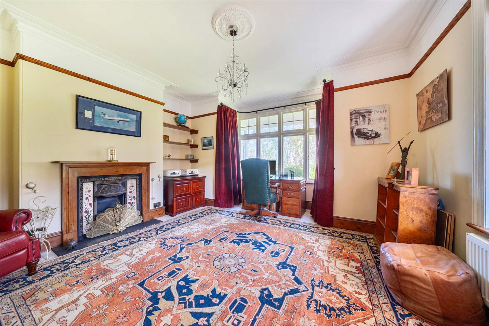 The study or drawing room is a particularly appealing room, enjoying a dual aspect with a bay window to the side and a further window to the front overlooking the grounds. It is a comfortable and characterful space, complete with integrated shelving and an original Victorian fireplace with oak surround and slate hearth, making it well suited to quieter evenings, reading, or home working in elegant surroundings.