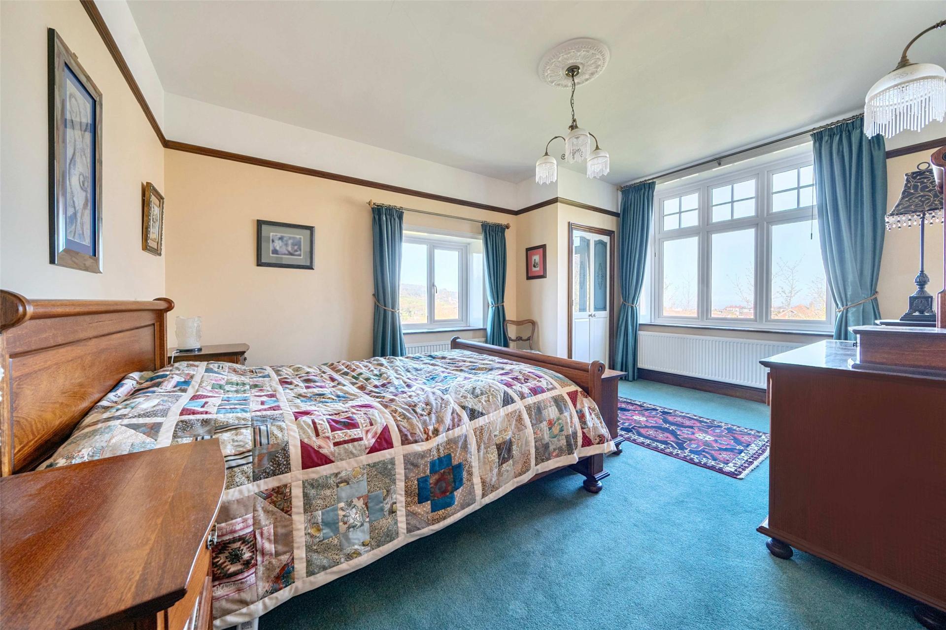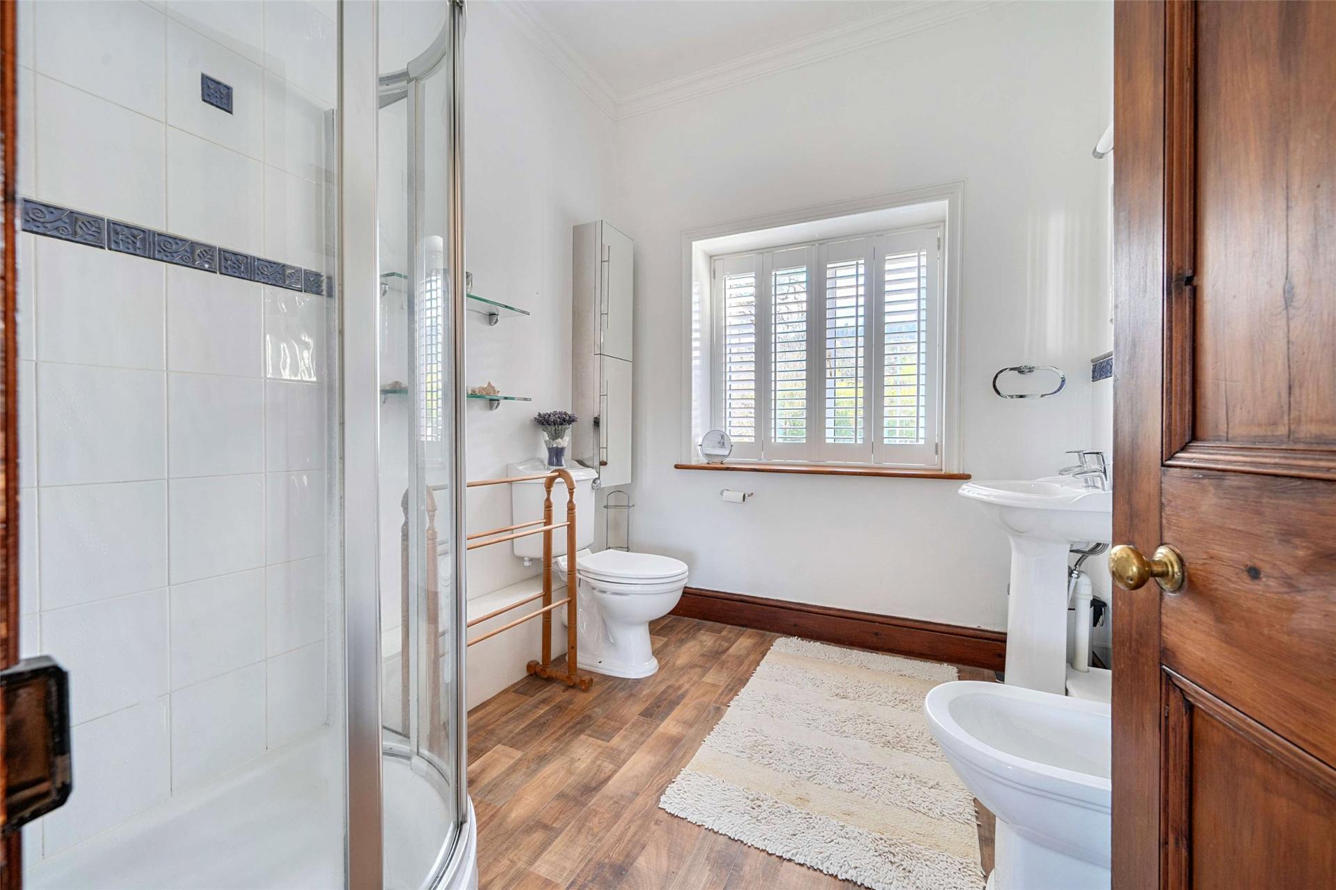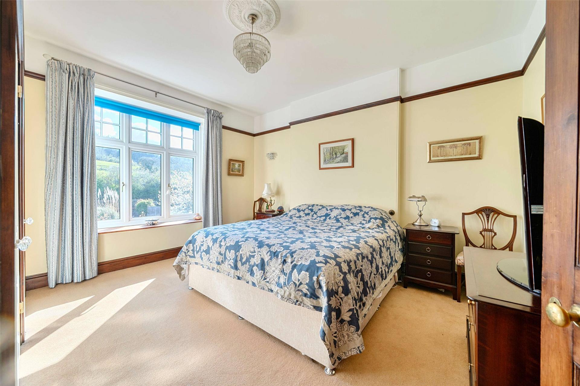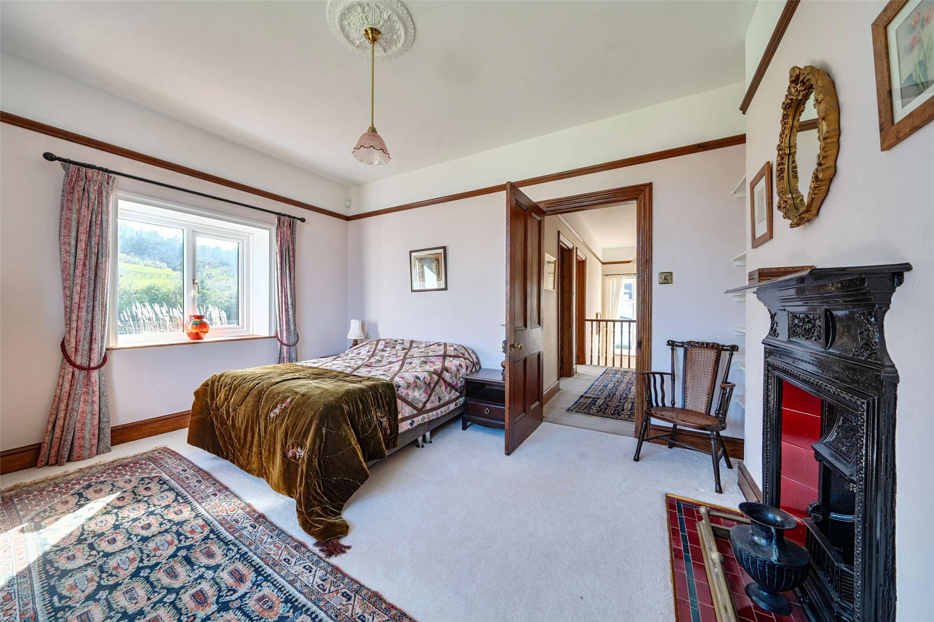 Upstairs, the sense of space continues. The landing is served by a large side window and built in storage, and the bedroom accommodation is especially generous. There are five double bedrooms in total, giving the house real versatility for family life, guests, or home working. The principal bedroom enjoys a dual aspect and takes full advantage of the exceptional outlook towards Exmoor and North Hill, while retaining its period character with an original fireplace and built in storage. Several of the other bedrooms also enjoy the same far reaching rear views, and others look over the gardens and woodland to the front, giving each room its own appeal. The shower room serves the first floor with a straightforward suite including shower cubicle, WC and wash basin.