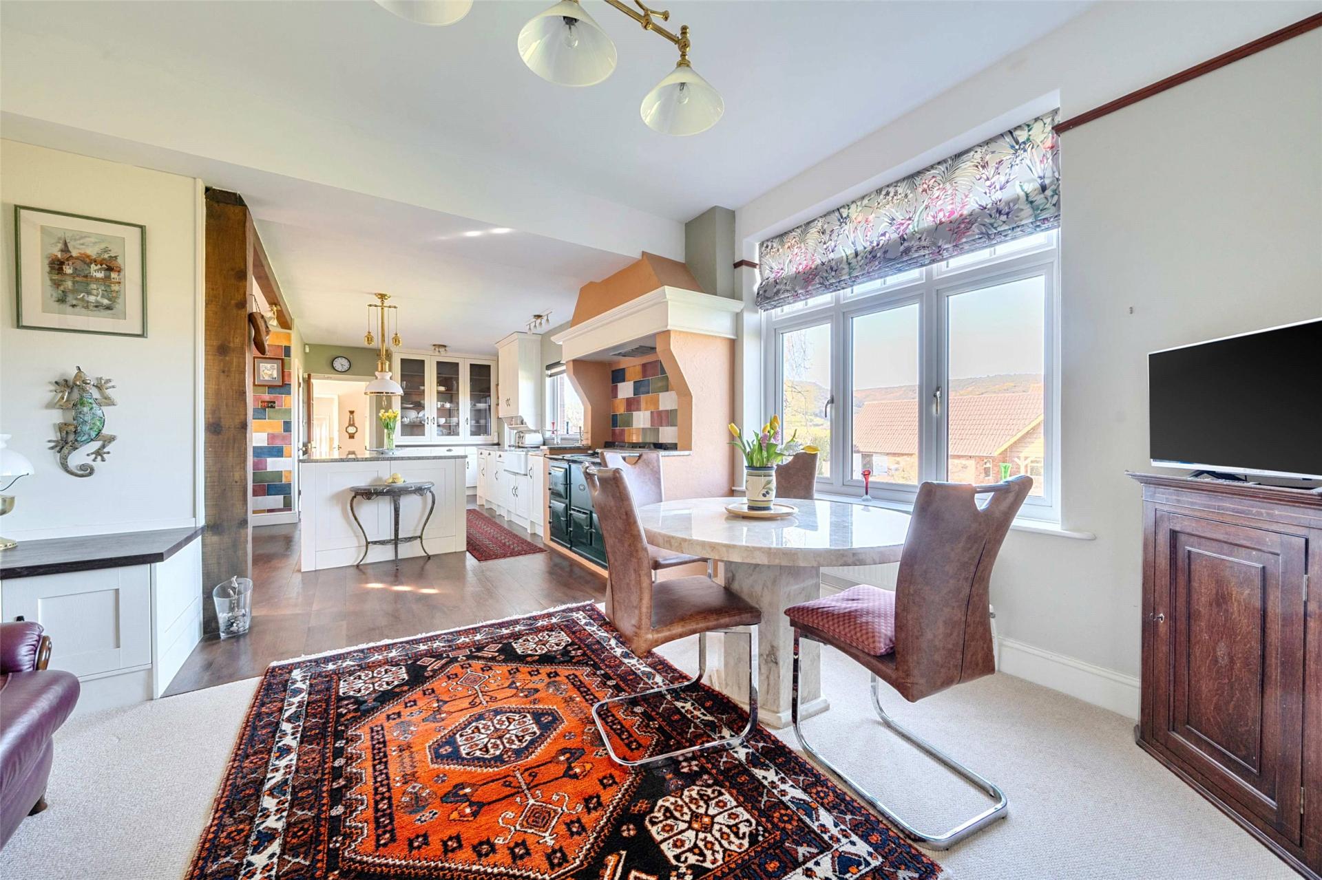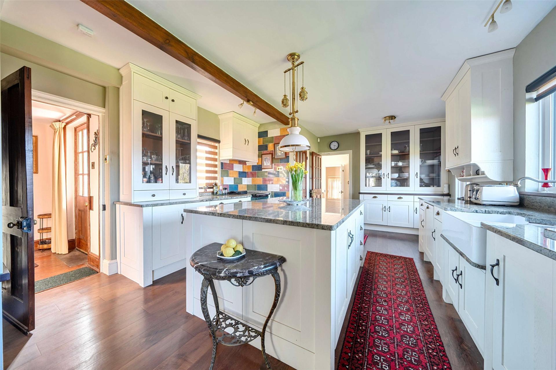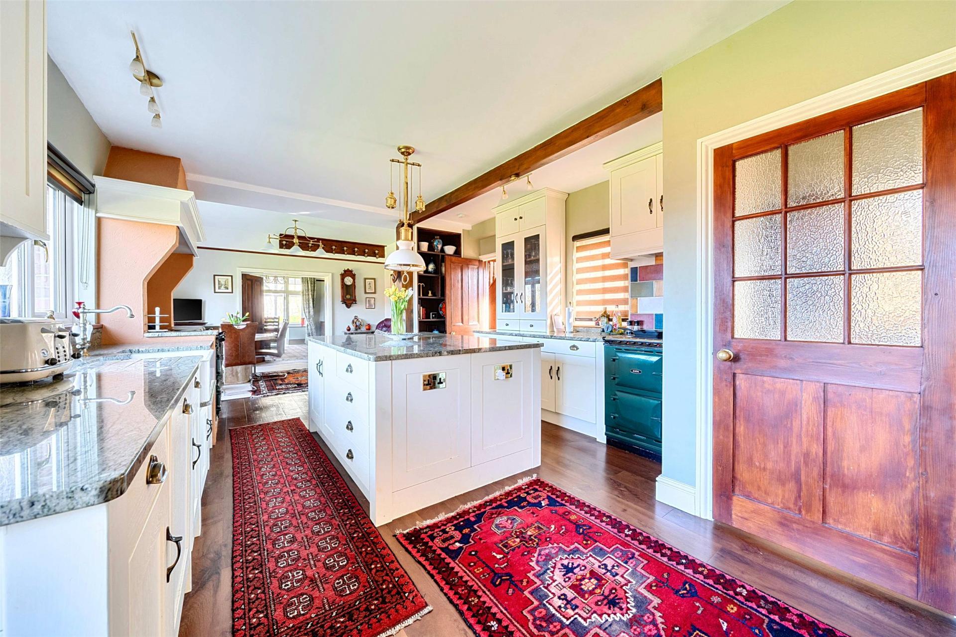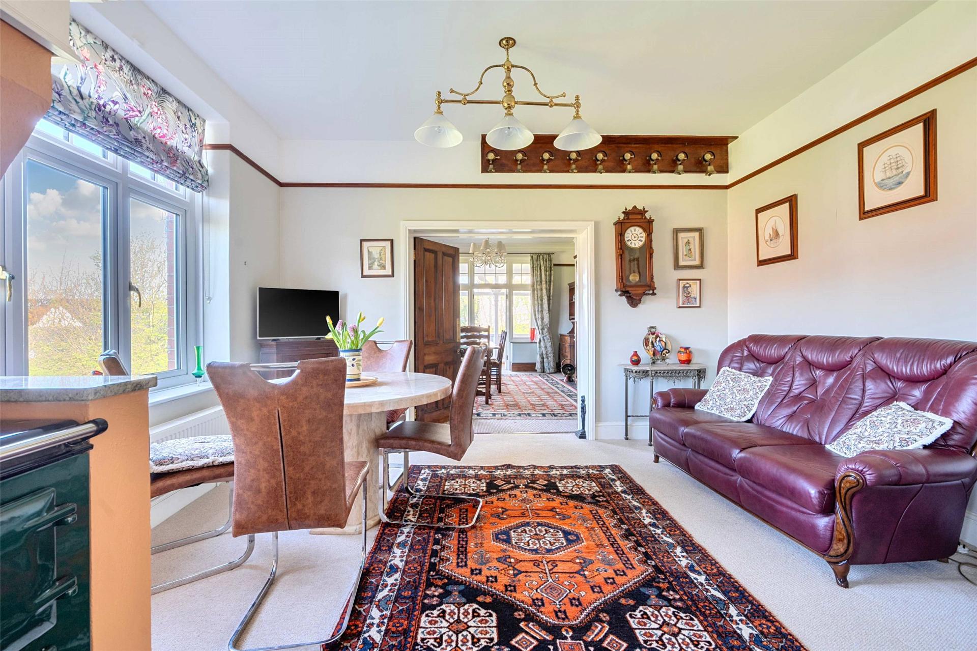 The kitchen and breakfast room forms the practical heart of the home and is arranged as a generous family space. Fitted with bespoke cabinetry and marble work surfaces, it combines everyday functionality with a traditional feel. A central island provides additional storage and workspace, while the inset double Belfast sink, large dual plate Aga, additional electric Aga and pantry cupboard reinforce the sense of this being a well planned room designed for both family life and informal entertaining. There is ample space to dine here, making it a sociable room that naturally draws people together.