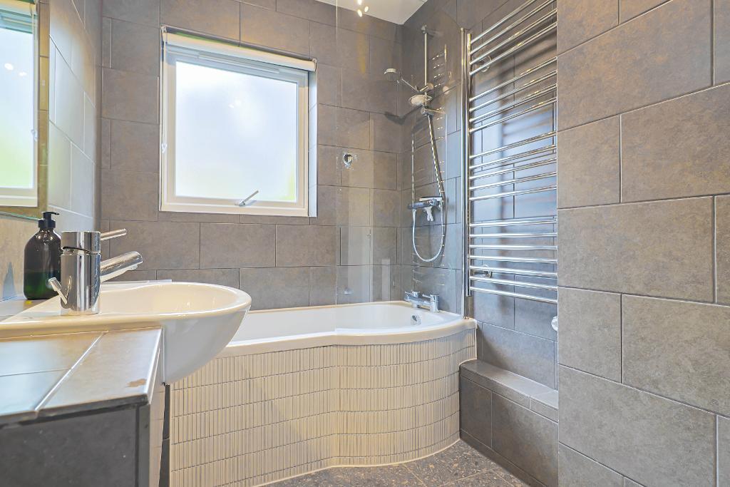 There are two generous double bedrooms, each with fitted wardrobes, and a contemporary white modern bathroom suite with complimentary grey tiling.
