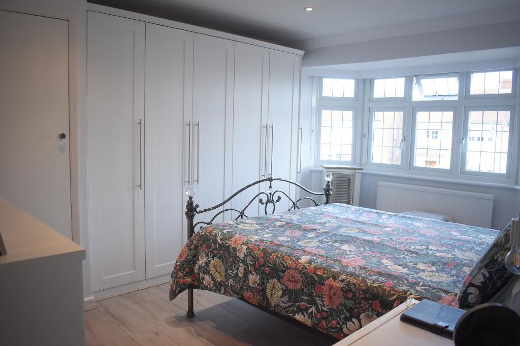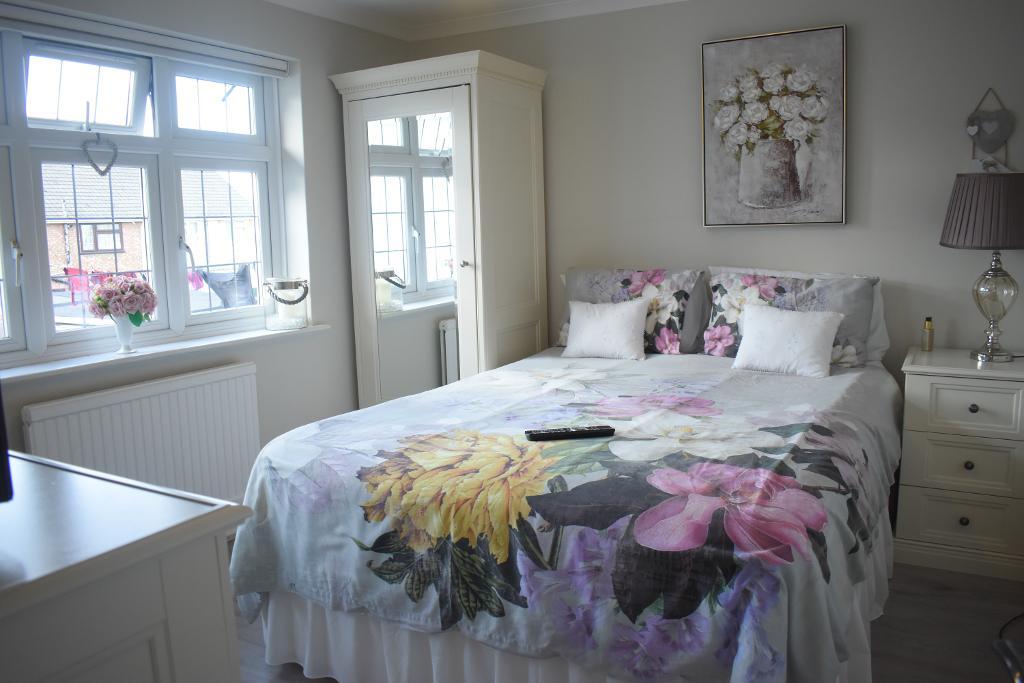 Bedroom one features double glazed glass leaded feature bay window to the front along with laminate flooring as well as built in cupboard and wardrobes.