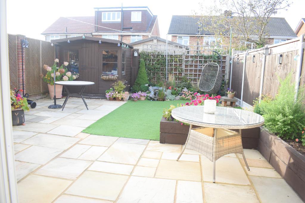 The rear garden has a large patio area to side as well as raised flower beds with astro turf and a small water feature and wooden shed to remain to rear.