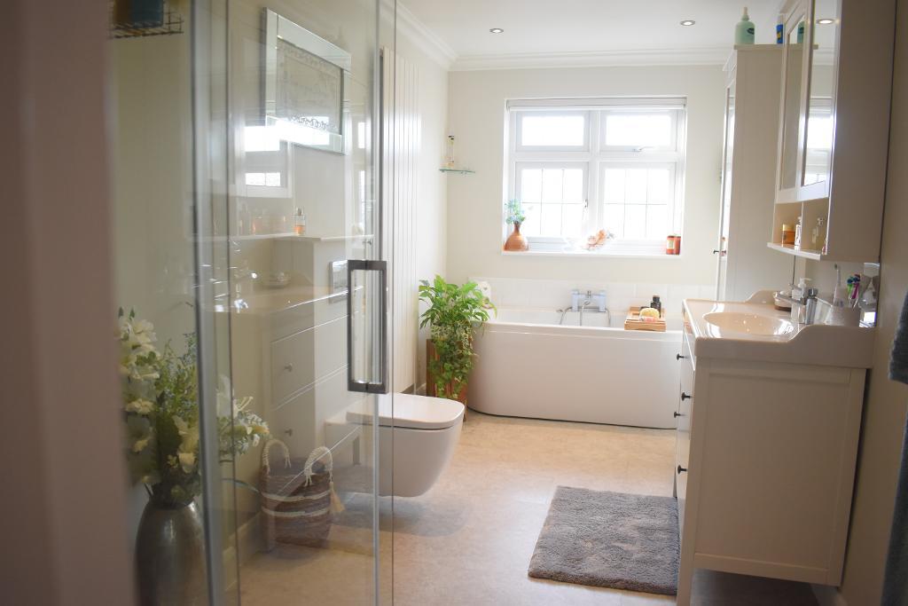 The first floor bathroom is beautiful and a fantastic size and features an obscured glass window to rear along with painted walls and vinyl flooring. The bathroom also has double shower cubicle to side along with rounded bath to rear and sink with under vanity unit.
