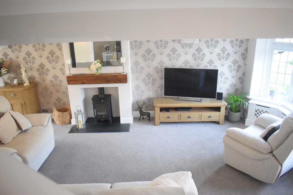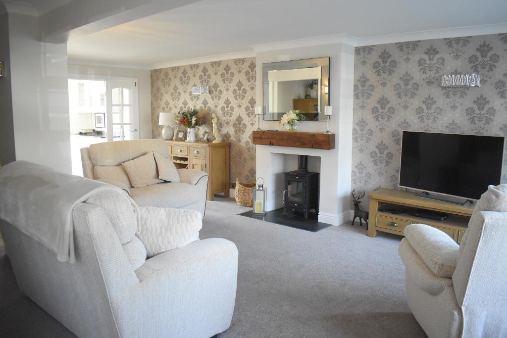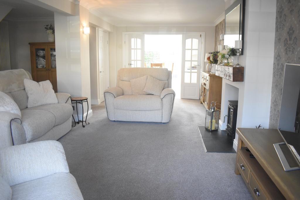 Coming into the bright and spacious lounge there is a large double glazed bay window to the front letting in ample natural light which shows off the carpeted floor and chimney breast to main wall which features a log burner. There are also two glass panelled wooden doors which lead to the kitchen/dining area.