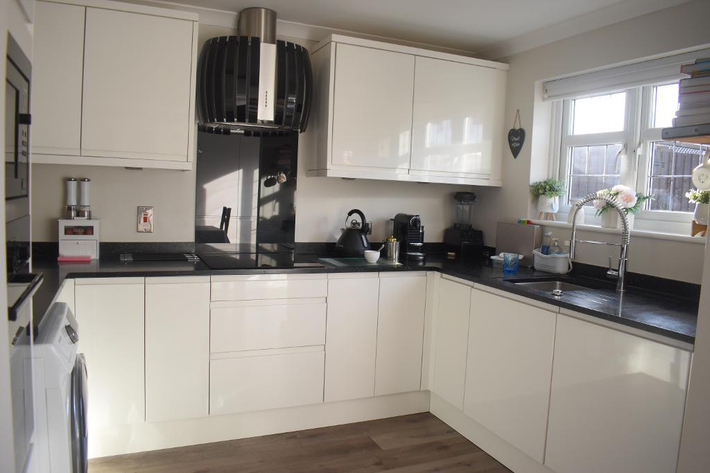 The kitchen has a range of base and eye level high gloss units with black marble effect worktops along with sink which has mixer tap, fitted oven hob and extractor fan as well as double glazed window looking to rear garden. There is also an integrated fridge freezer.