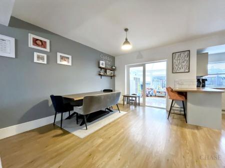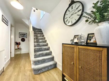 The spacious entrance hall leads to a bright and airy living room, which flows seamlessly into the contemporary open plan kitchen. The kitchen is fitted with high-quality units and integrated appliances, providing ample space for dining and entertaining.
