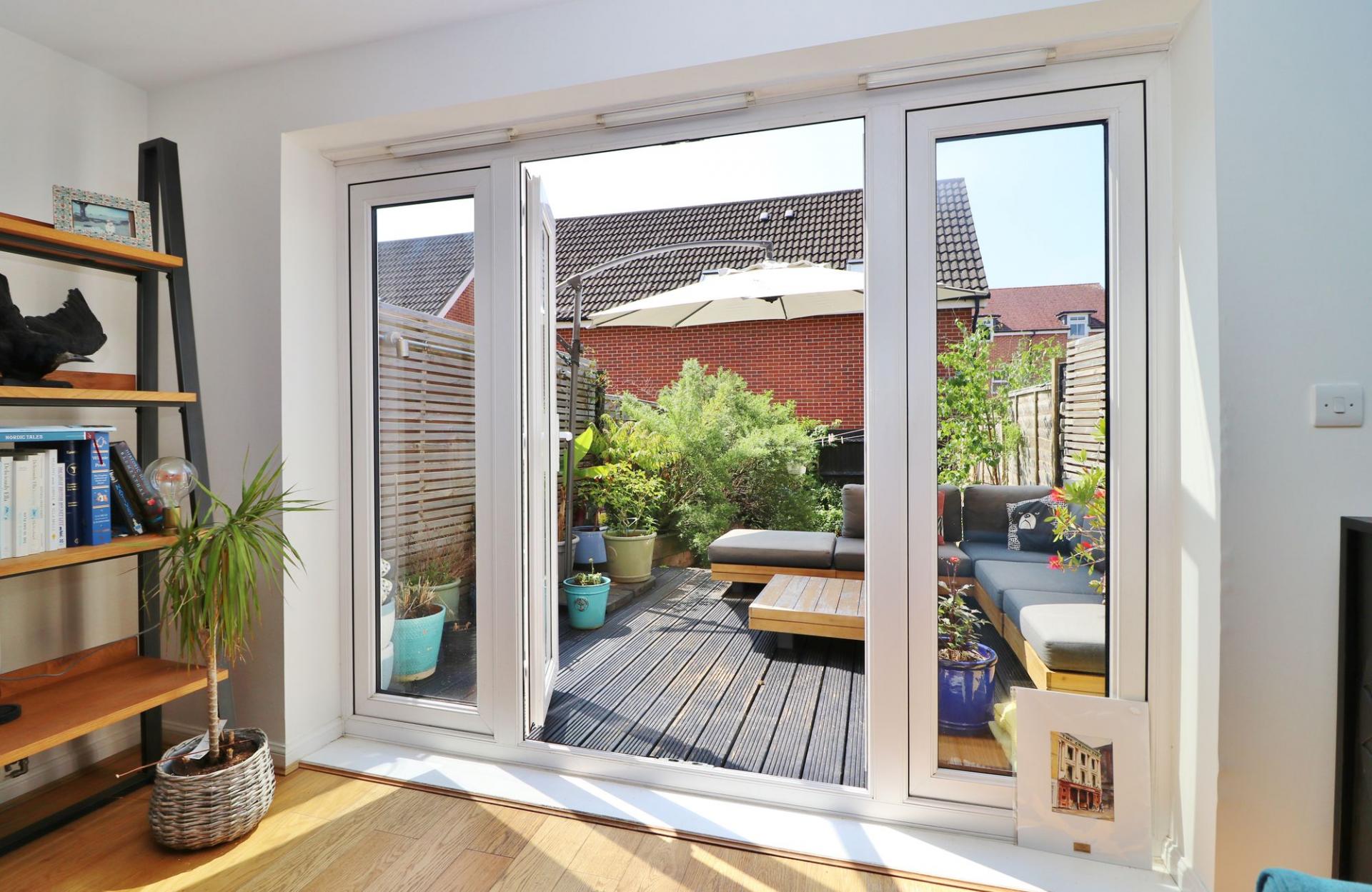 The attractive rear garden enjoys a southerly aspect and has a decked seating area, leaving the rest of the garden mainly laid to lawn with planted borders and gated, rear pedestrian access leading round to the single garage.