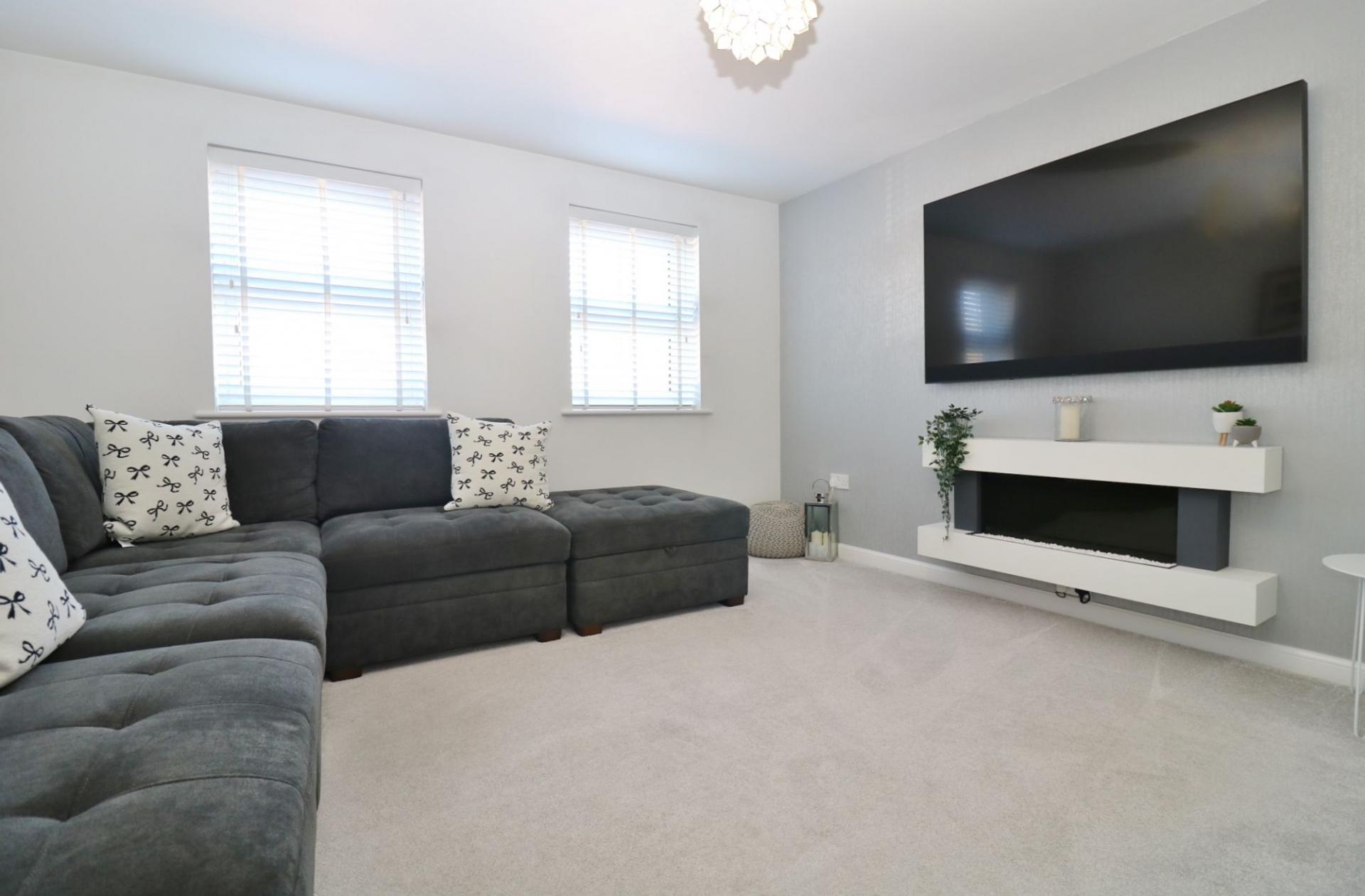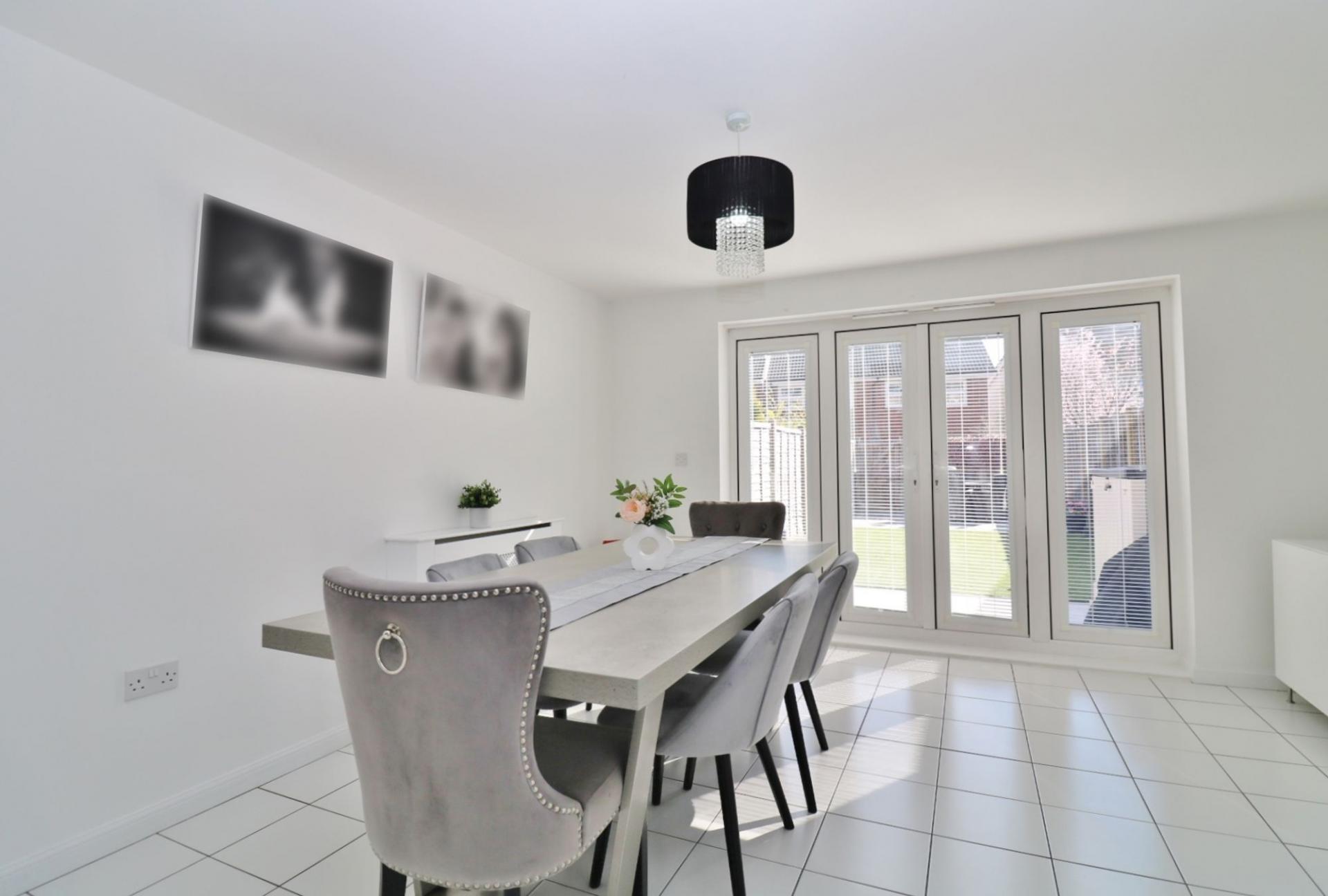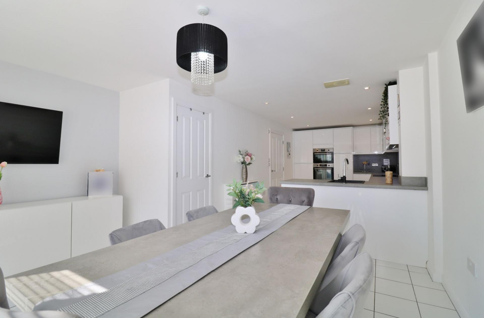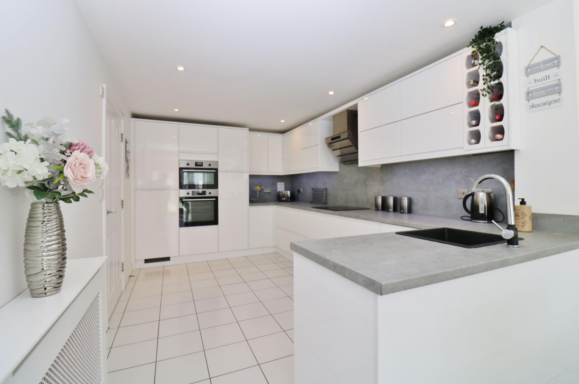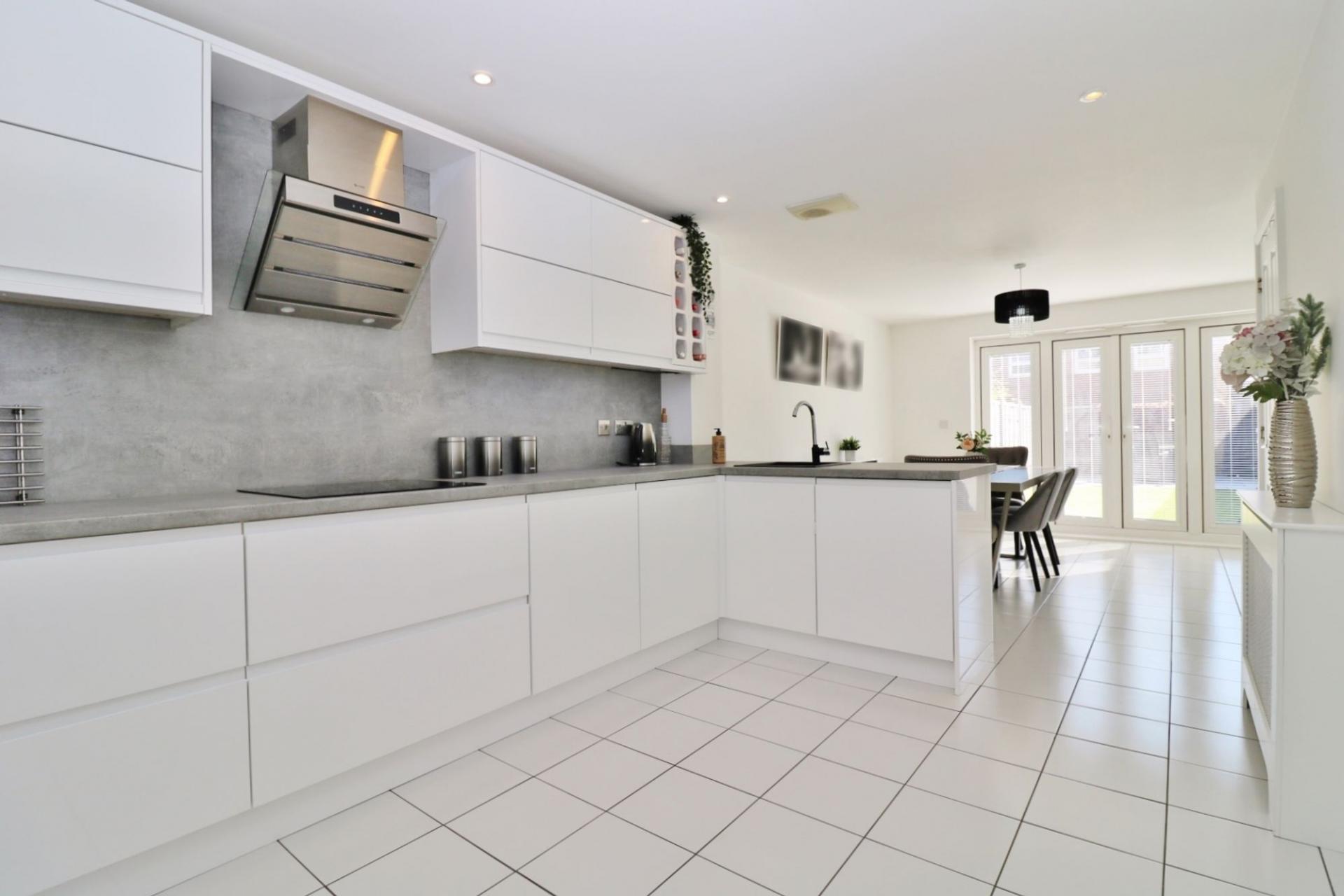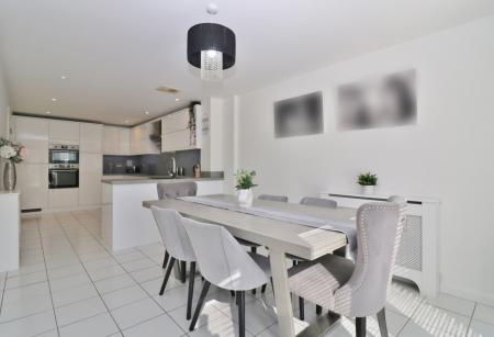The wonderfully spacious kitchen/dining room has been fitted with a sleek range of white wall and base units with a built-in double oven, hob with extractor over and integrated appliances including a fridge/freezer, dishwasher and washing machine. There is a built-in storage cupboard to one side and French doors from the dining area opening out to the rear garden.