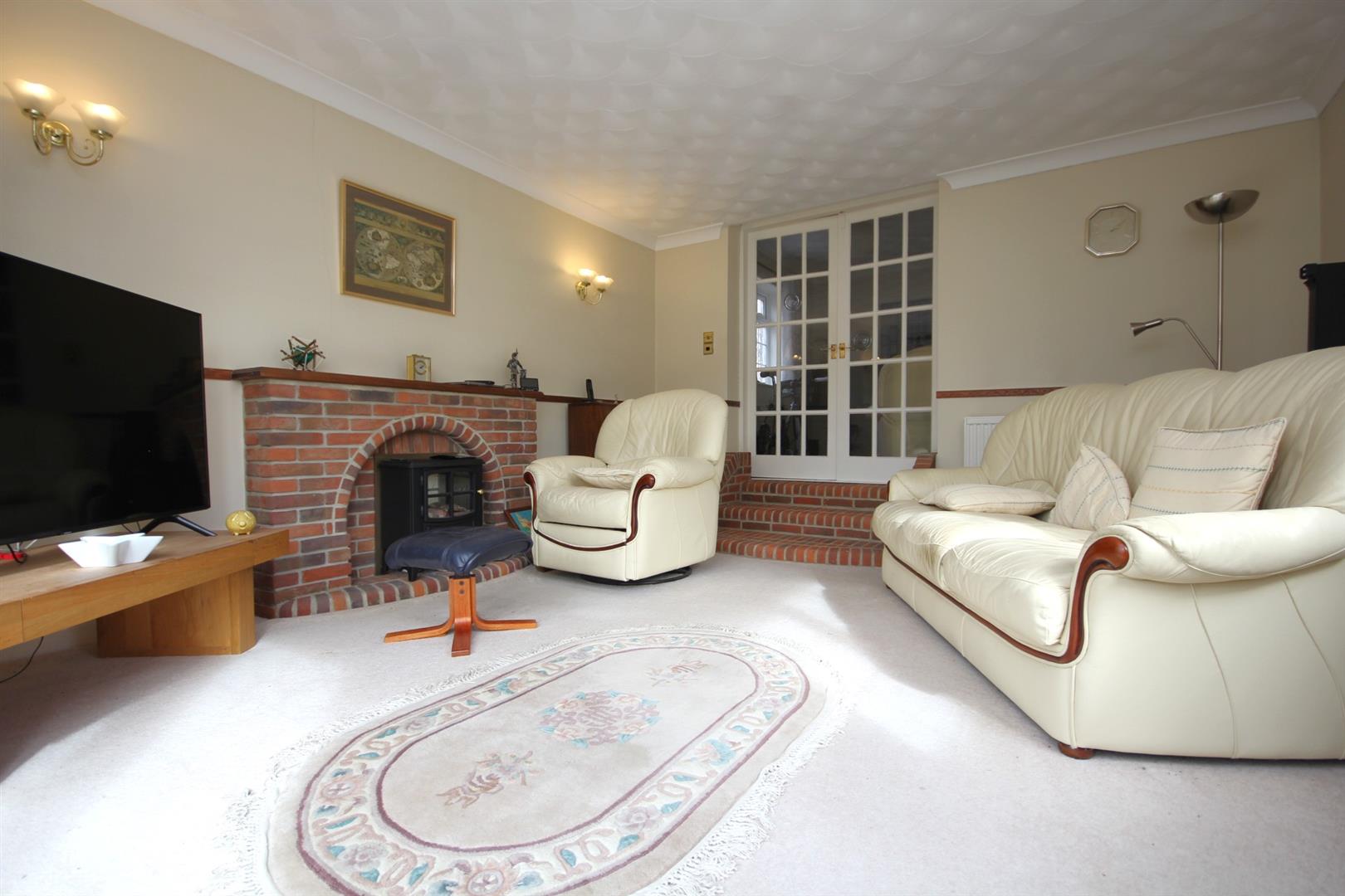 Dual aspect lounge with centrepiece brick surround fireplace & double doors opening out to the rear garden