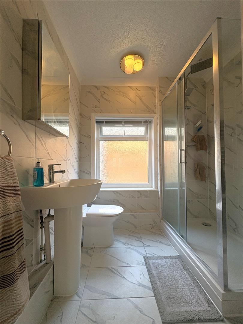 Modern re-fitted shower room comprising three piece white suite & attractive marble effect wall/floor tiling