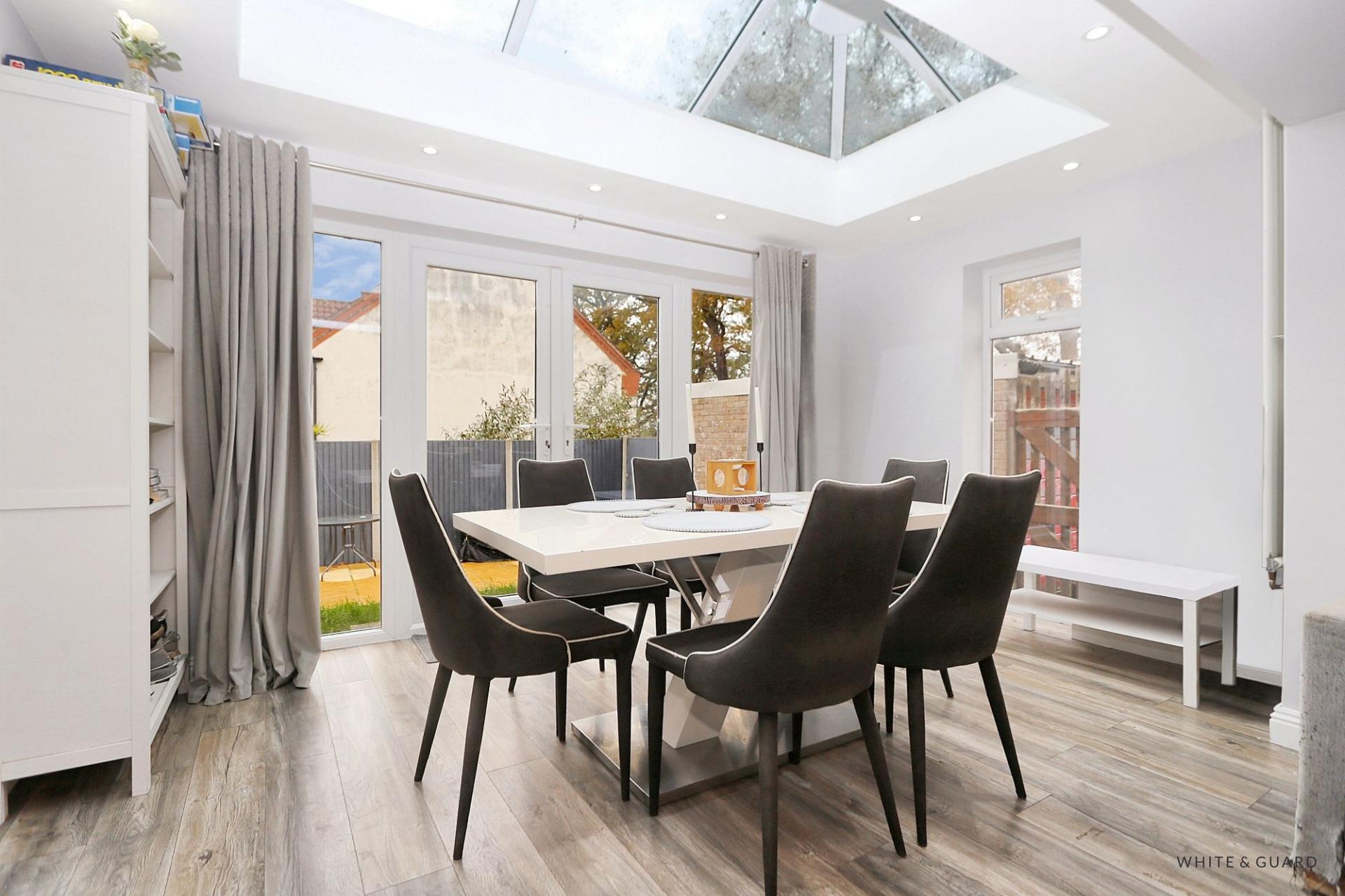 Flowing seamlessly from here, the open-plan lounge and dining area provides a stunning social hub — perfect for family gatherings or relaxed evenings in. The skylight in the extended section floods the space with natural light, enhancing the home’s contemporary and airy feel. Double doors open directly onto the garden, creating that perfect indoor-outdoor connection.