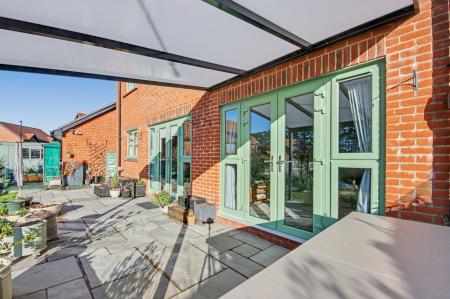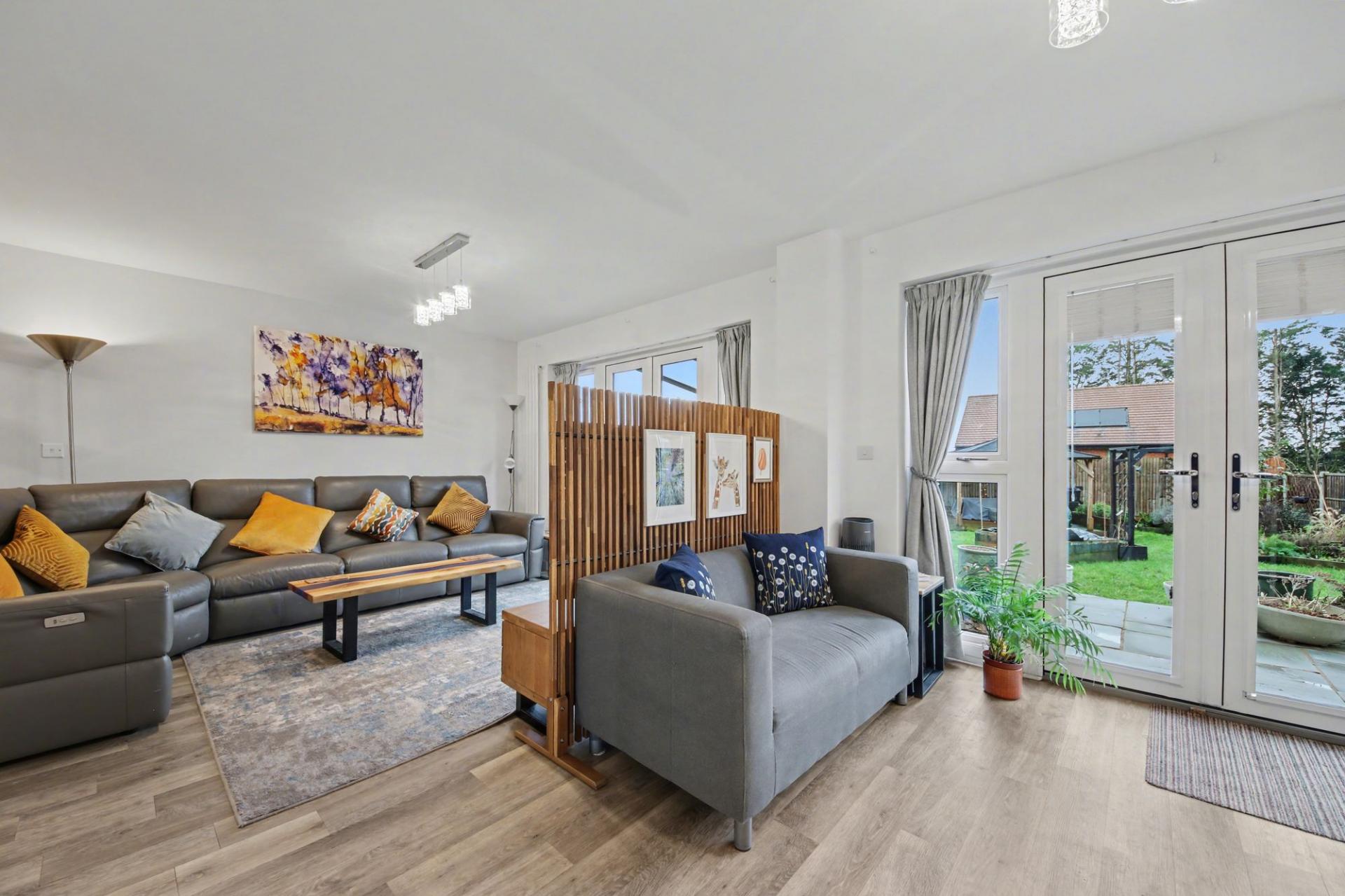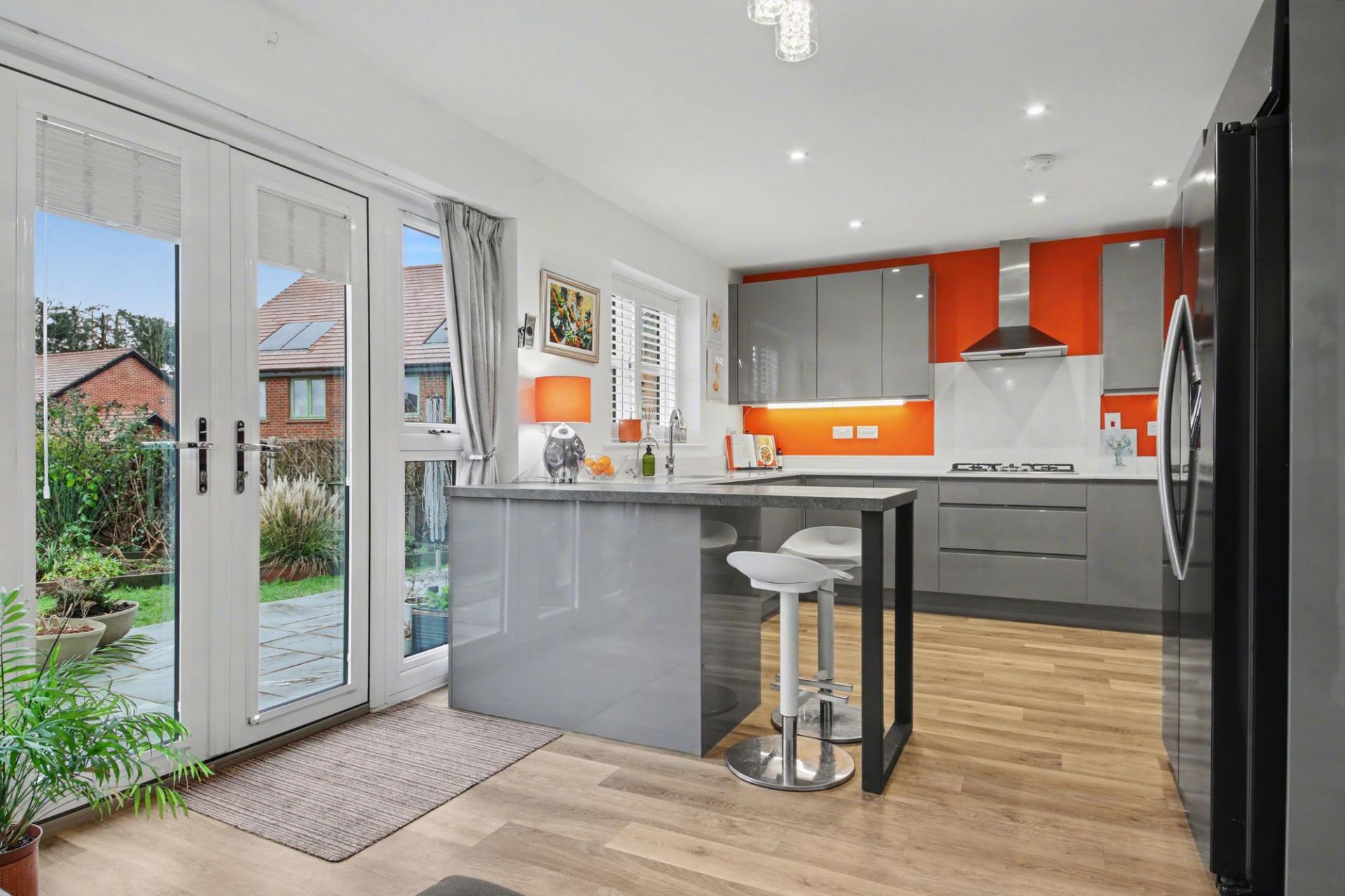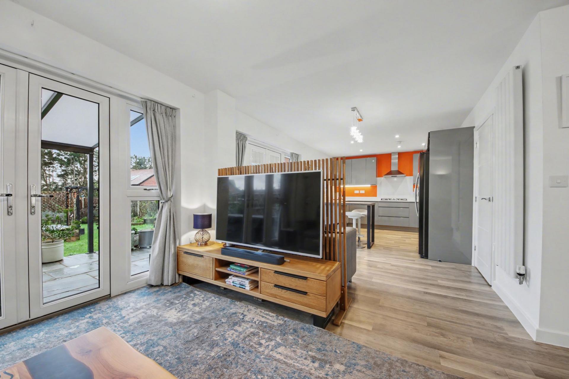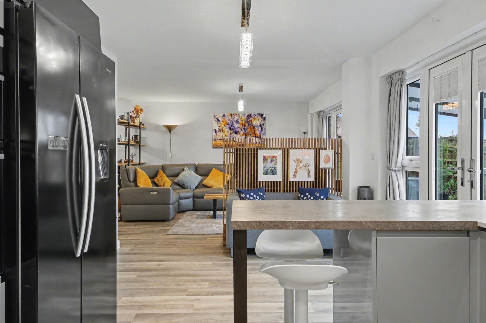 At the heart of the home is the exceptional L-shaped kitchen and living space, designed specifically for modern, social living. This impressive area effortlessly combines cooking, dining and relaxation, making it the perfect setting for entertaining or everyday life. The high-end kitchen features bespoke upgrades, quality cabinetry, premium work surfaces and integrated appliances, complemented by a stylish utility room that mirrors the same elevated standard. Two sets of double doors flood the space with natural light and create a seamless connection to the garden beyond.