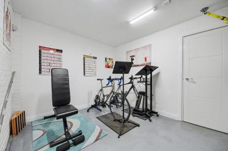 To the front, the property is complemented by a double garage, which has been cleverly part-converted to create a dedicated gym space. This conversion has been expertly executed to ensure that storage, access and the remaining garage functionality are not compromised, offering flexibility for fitness, hobbies or home working while retaining everyday practicality.
