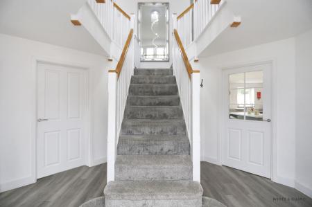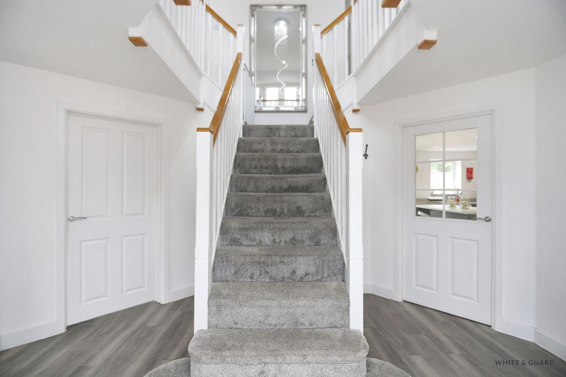 Step through the front door and you’re immediately greeted by a grand entrance hallway, where a show-stopping cruise-ship style staircase sweeps upwards and divides gracefully into two, creating an ultra-impressive mezzanine landing that sets the tone for the rest of this remarkable home.
