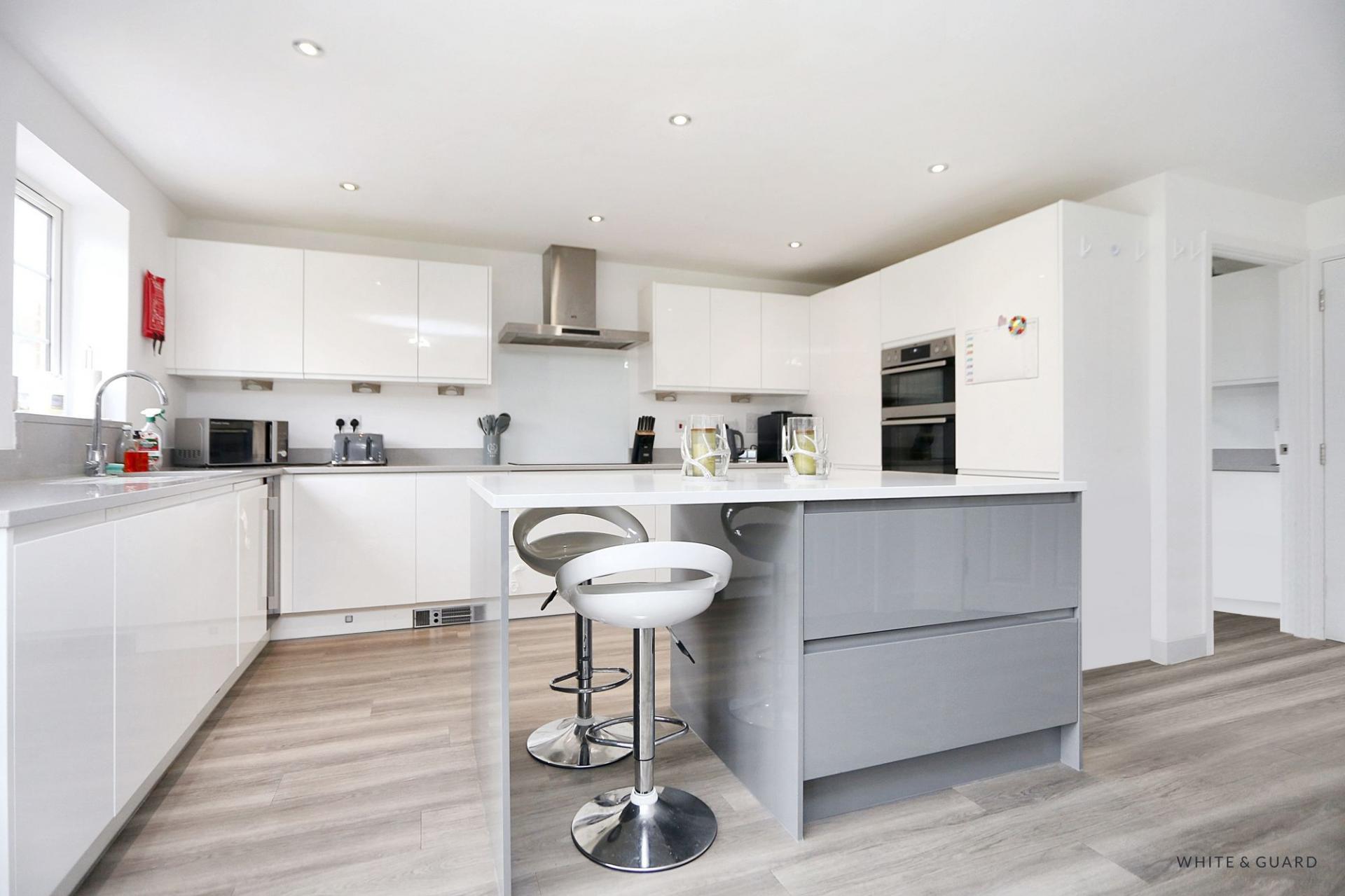 At the rear, the home opens up into a breathtaking open-plan kitchen, dining, and family area, the true heart of the property. Sleek cabinetry, high-end appliances, and bespoke finishes combine with an abundance of natural light to create a stylish and sociable hub that overlooks the garden. A separate utility room provides additional practicality, keeping the main space beautifully uncluttered.