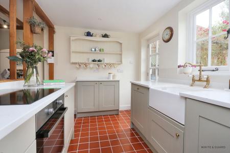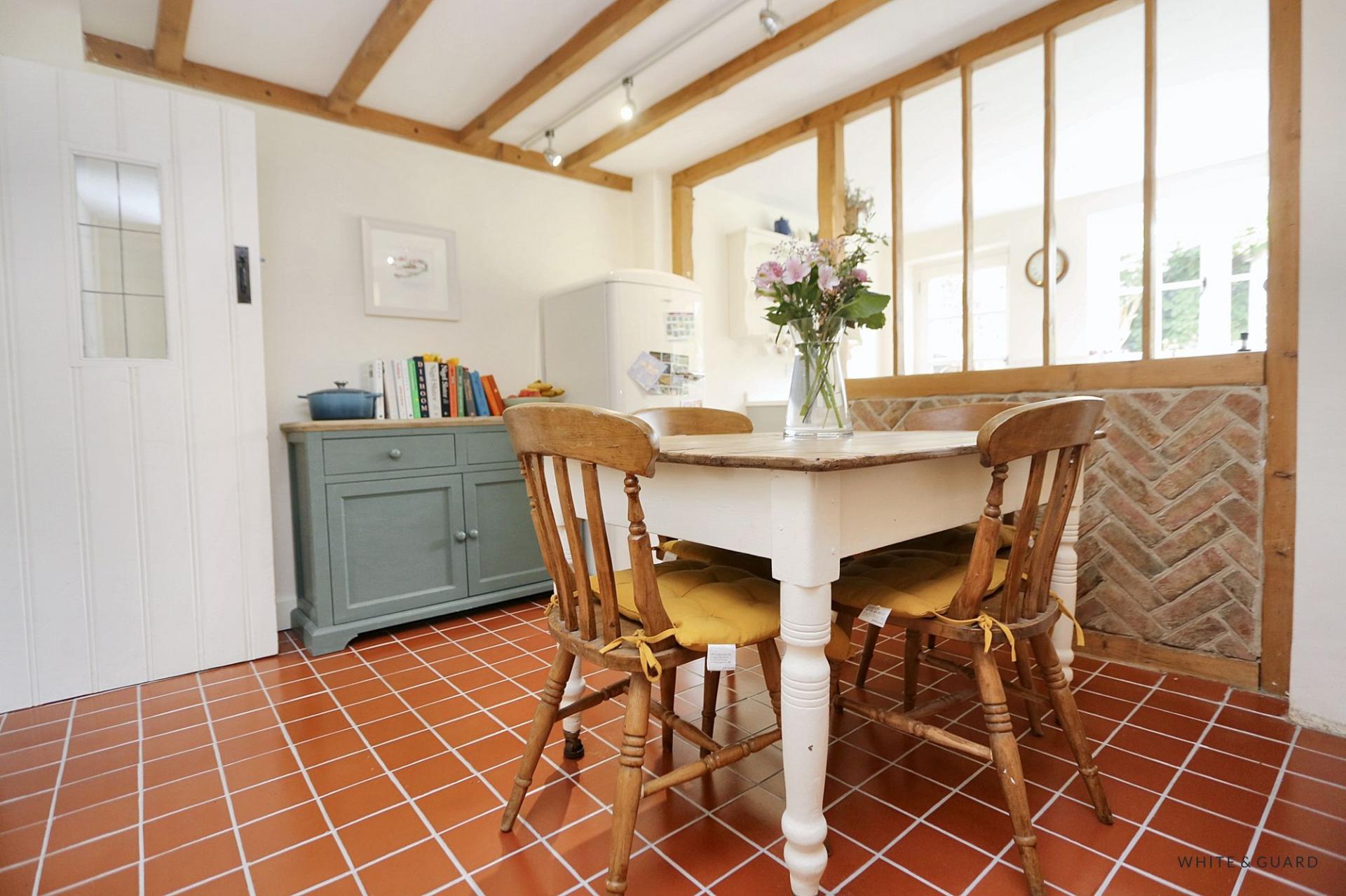 The front door opens into the entrance porch which provides useful shoe and coat storage while a further door leads through to the sitting room. The sitting room itself benefits from triple glazed windows (fitted in 2020) to the front elevation and features a log burning fire with fitted shelving to either side of the chimney breast. The kitchen dining room is set at the rear of the house and features an original quarry tiled floor that has been restored by the current owners and presents beautifully, in keeping with the age and charm of the house. The dining area has exposed beams and a half height wall set in herringbone brick work and the room transitions into the impressive re-fitted kitchen. Installed in 2021, the kitchen showcases a range of base level work units with quartz work surfaces over which incorporate an inset butler sink with traditional style brass mixer tap, induction hob, electric oven and space is provided for a Rayburn cast iron central heating range cooker. Further integrated appliances within the kitchen include a dishwasher and washing machine. A door to the rear provides direct access onto the private garden. Completing the ground floor space is an inner hall which has a flight of stairs leading to the first floor.