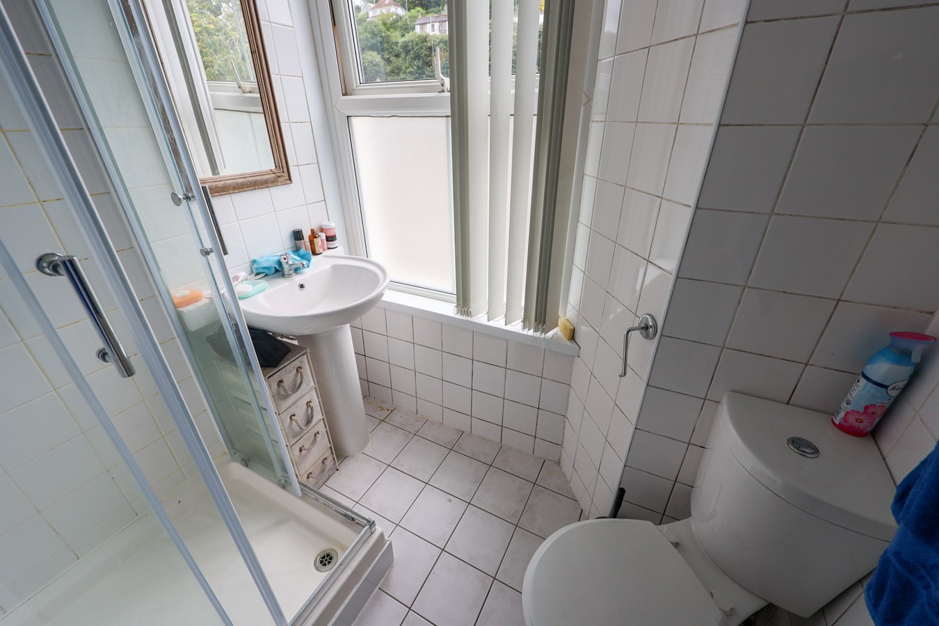 The bathroom features a white three-piece suite, including a shower cubicle with an electric shower, a low-level W.C., and a wash hand basin. A window to the front adds natural light, making the space bright and airy.