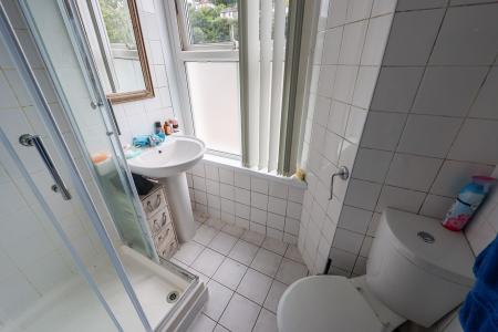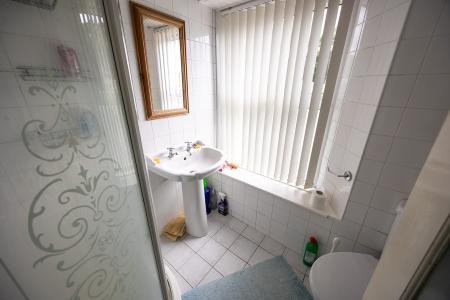 With a white three piece comprising shower cubicle with electric shower, wash hand basin, low level W.C. window to the front.