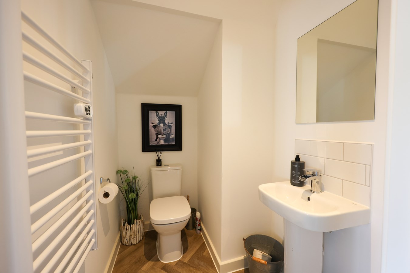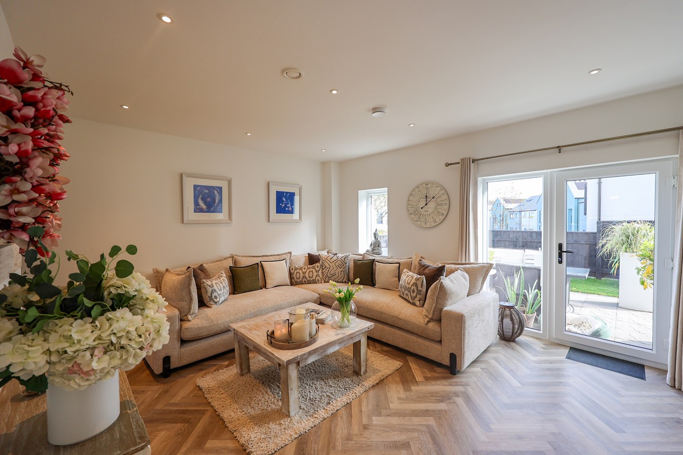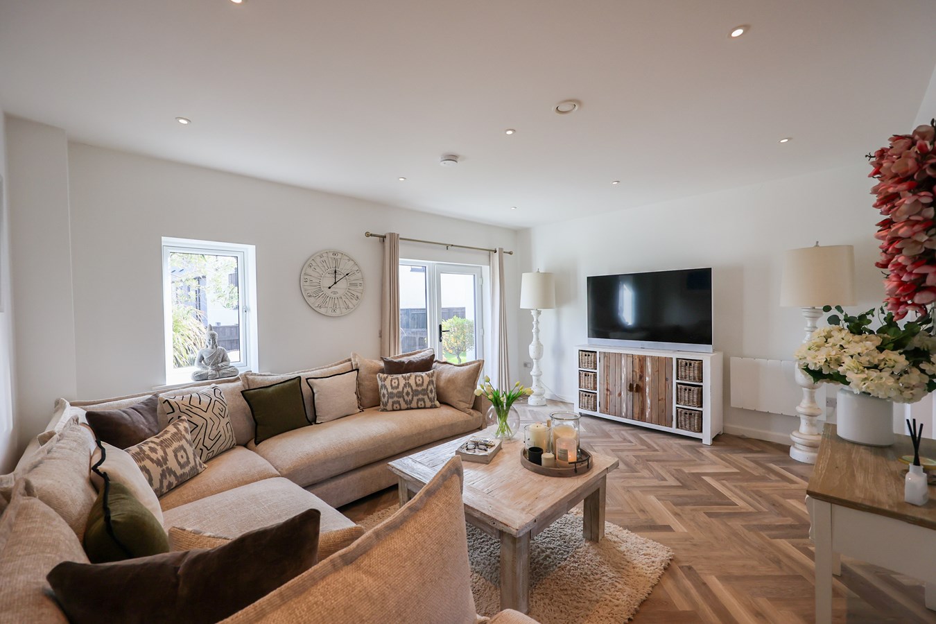 The open-plan layout is beautifully finished throughout, with standout features like LVT herringbone flooring across the ground floor and a sleek kitchen packed with integrated appliances and soft-close storage.