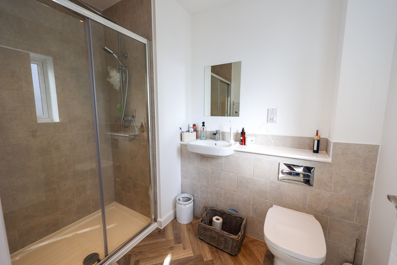 1.82m x 1.74m (5'11" x 5'8") Recessed spotlights. Frosted double glazed window to the rear aspect. Splashback tiling. Mains fed waterfall shower cubicle. Wash basin. Shaver points. Heated towel rail.