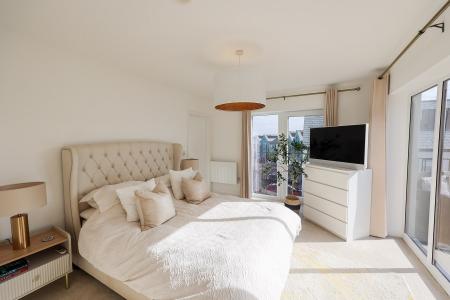 3.99m x 3.35m (13'1" x 10'11" ) This room features doors?one opening to a Juliet balcony, the other to a spacious decked balcony?bringing in plenty of natural light and offering seamless indoor-outdoor living. An panel radiator adds comfort. Doors leading into: