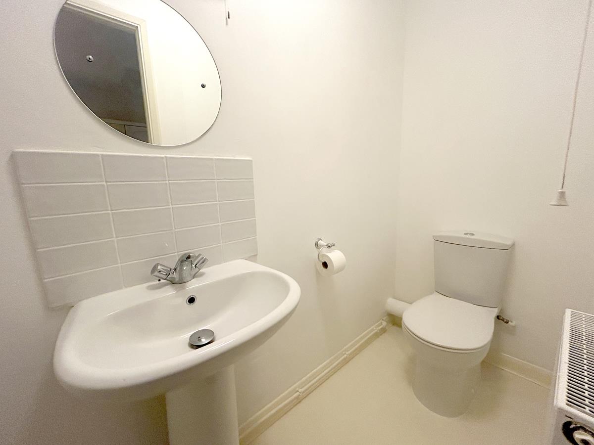 W.C. - With dual flush W.C., pedestal wash hand basin with tiled splashback and mirror over, stone effect flooring.