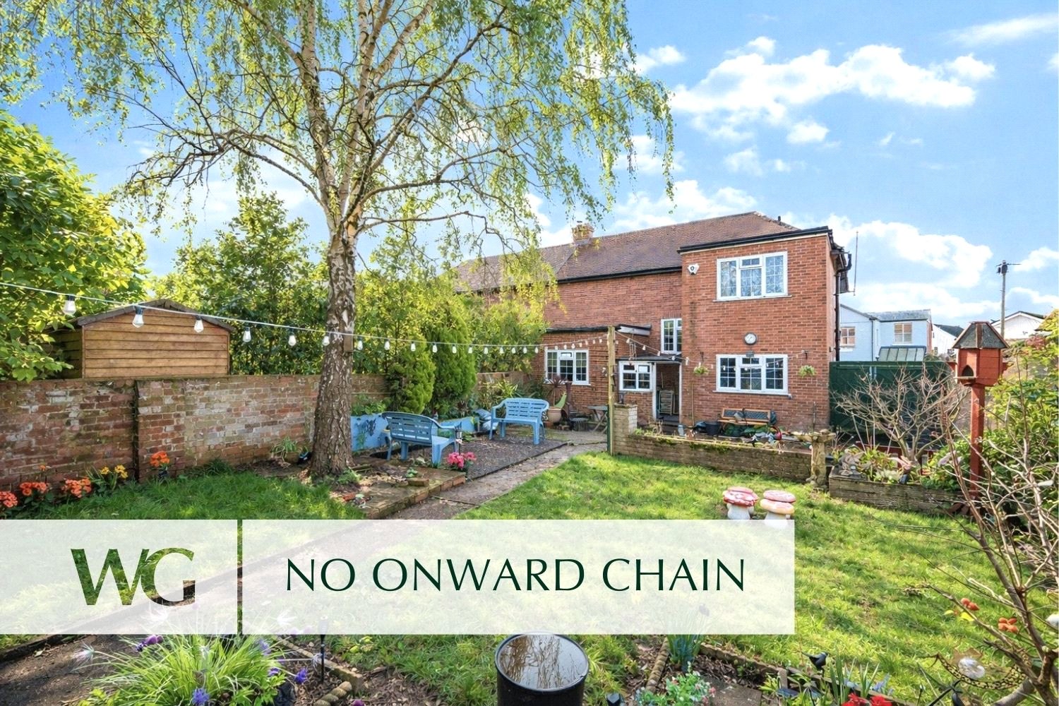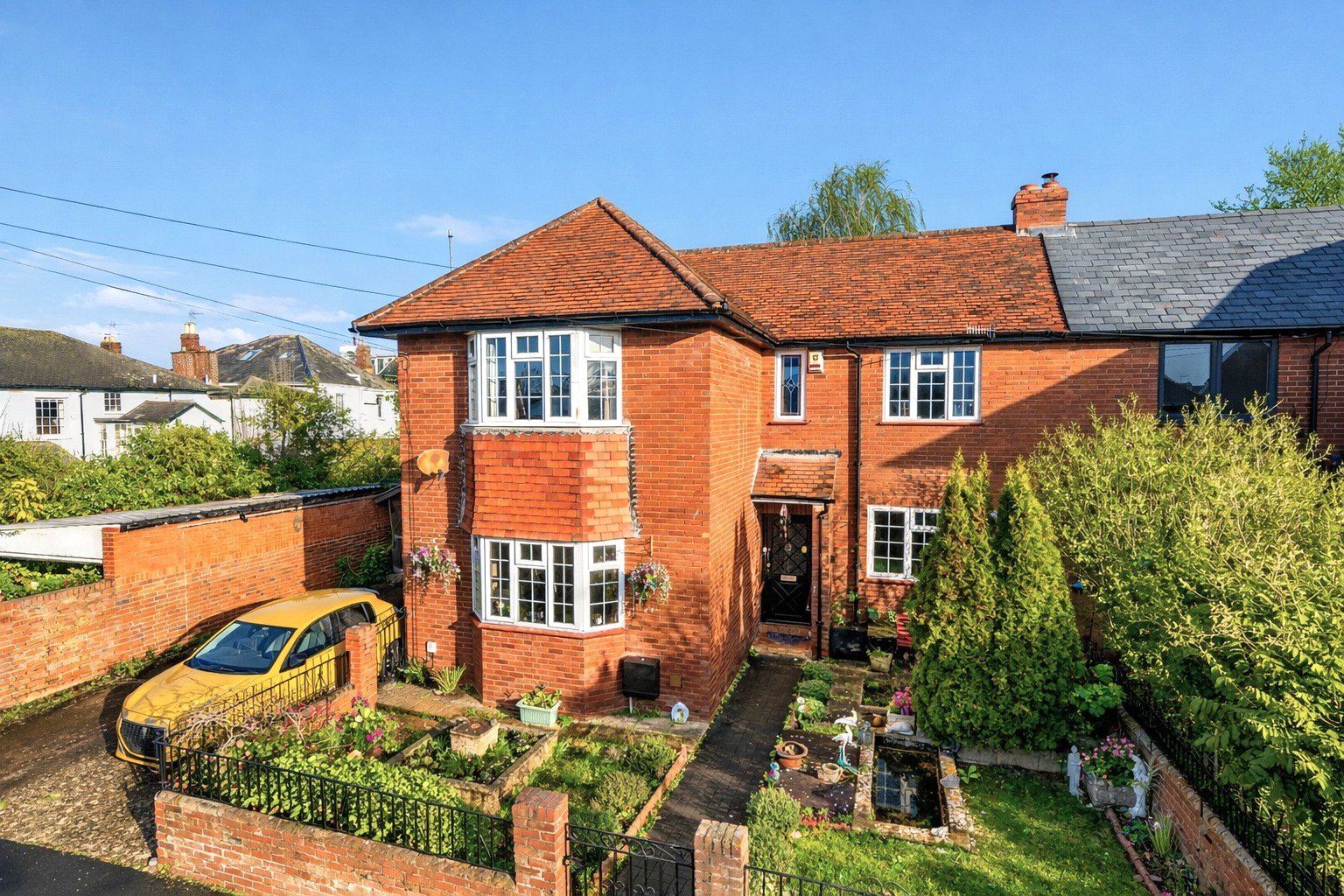 Outside, the property provides driveway parking for approximately three vehicles. The front garden is mainly laid to lawn with well-stocked perimeter borders and an ornamental pond. Timber gates open from the driveway to the good-sized rear garden, where a large patio sits adjacent to the house, ideal for outdoor dining and entertaining, leading onto a lawned area with established planted borders and a brick storage shed.