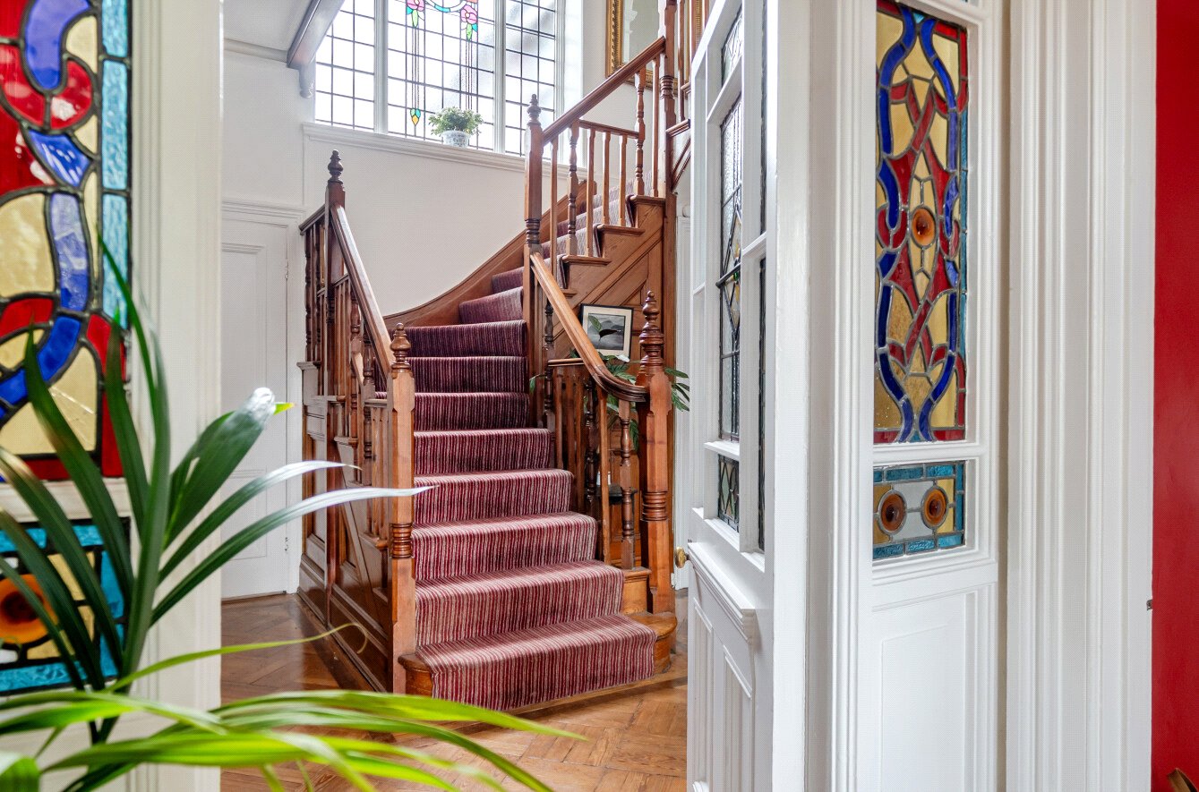 The property makes a strong first impression, with its red-brick façade set within a mature and established setting. Inside, a welcoming reception hallway immediately reflects the homes period heritage, with beautiful stained glass, ornate ceiling detailing and moulded coving all contributing to the character and quality.
