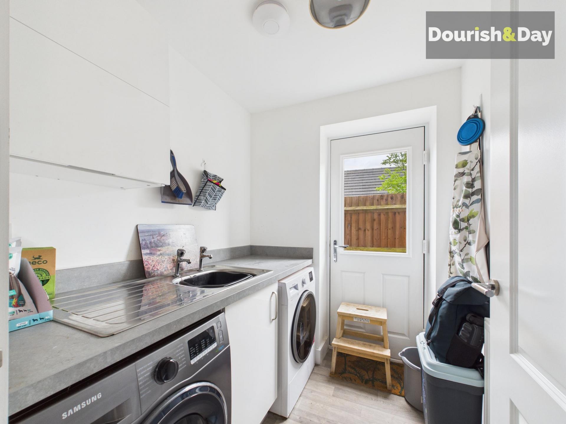 Step inside and you’re welcomed by the hallway, with a handy guest WC to one side. The spacious living room at the front offers a calm, cosy spot for evenings in, while across the back of the home, the open-plan kitchen and dining space is bright, social, and well-equipped as it comes complete with an integrated double oven, five-burner gas hob, fridge freezer and dishwasher. A separate utility room keeps the practical bits neatly tucked away.