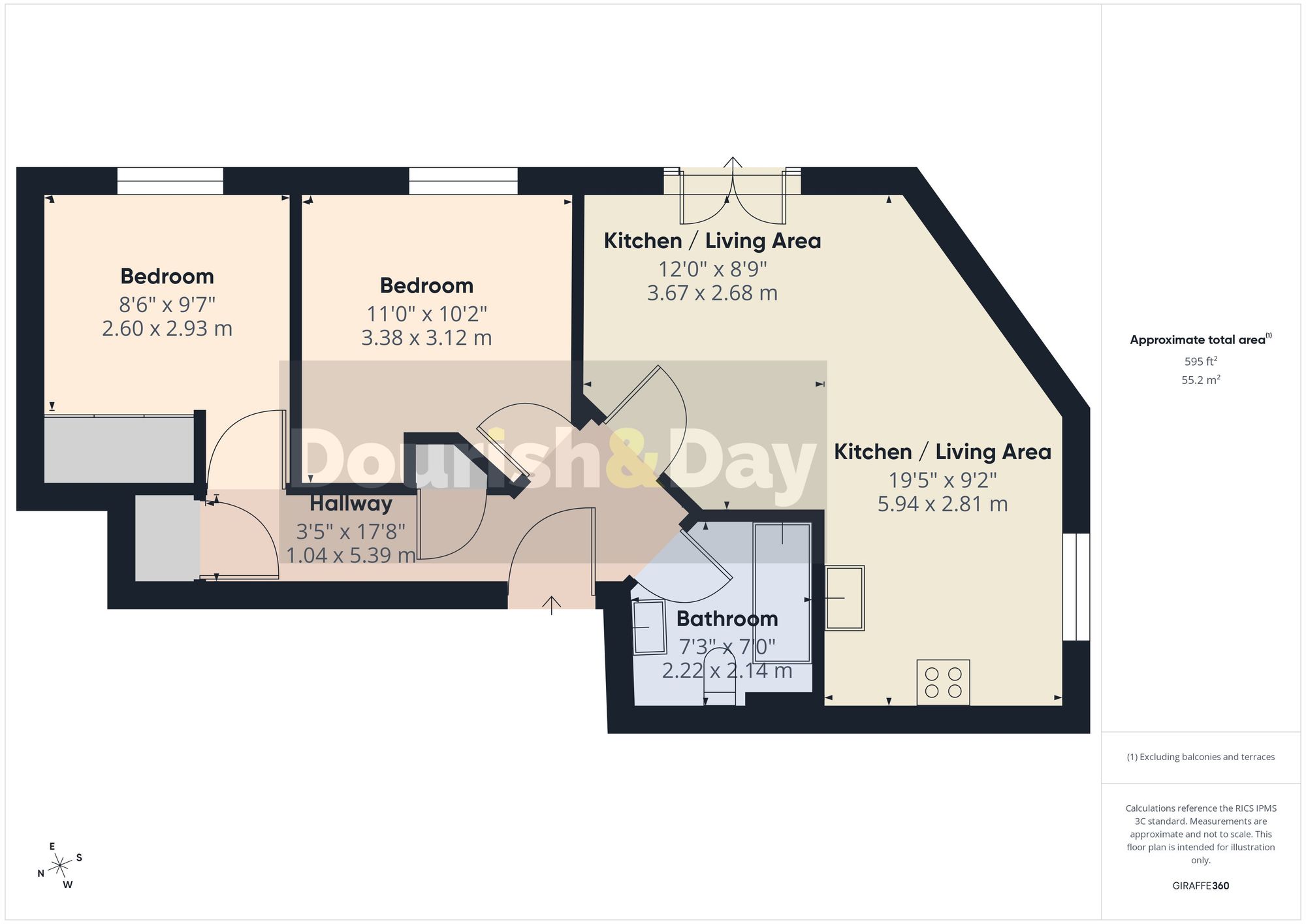 The accommodation comprises a welcoming entrance hallway with ample built-in storage, two generous double bedrooms, a modern bathroom, and a bright open-plan kitchen/living/dining area. The living space benefits from a Juliet balcony, allowing plenty of natural light and creating an ideal space for both relaxing and entertaining.