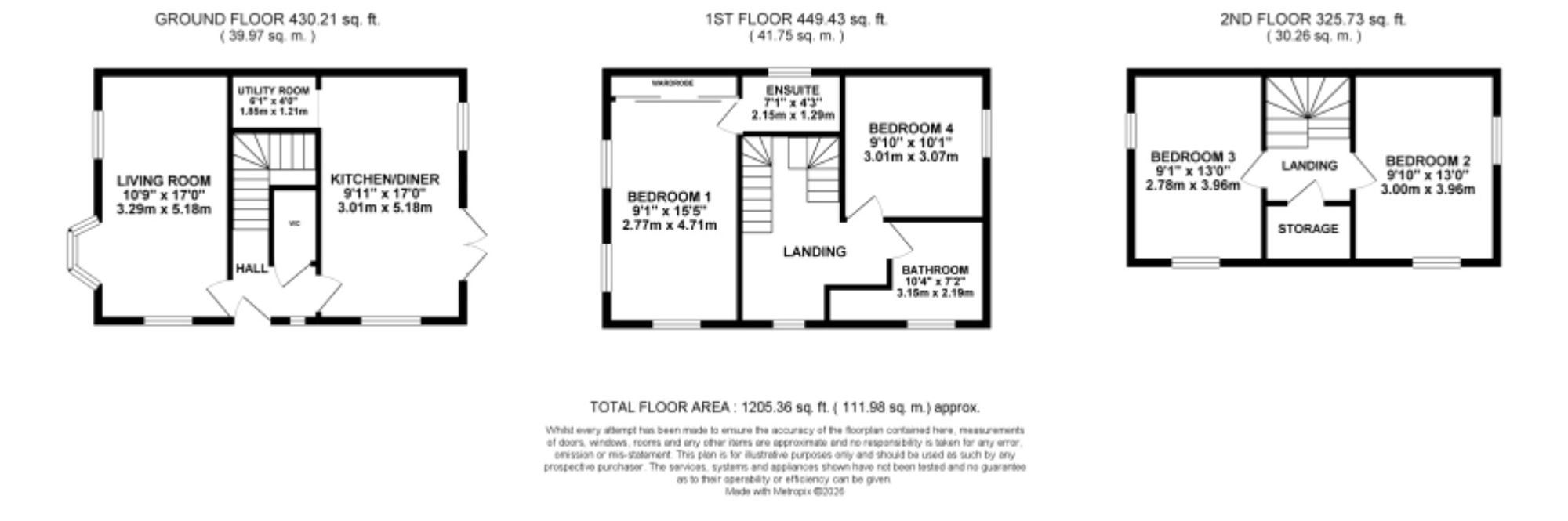 The first floor is home to a generously sized master bedroom with fitted wardrobes and its own en suite shower room, a further double bedroom, and a family bathroom with a bath, separate shower, sink, and W/C. The second floor offers two further double bedrooms and a storage room.