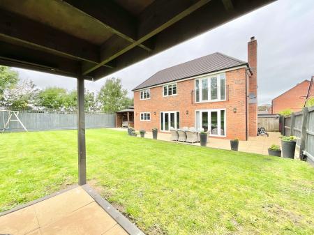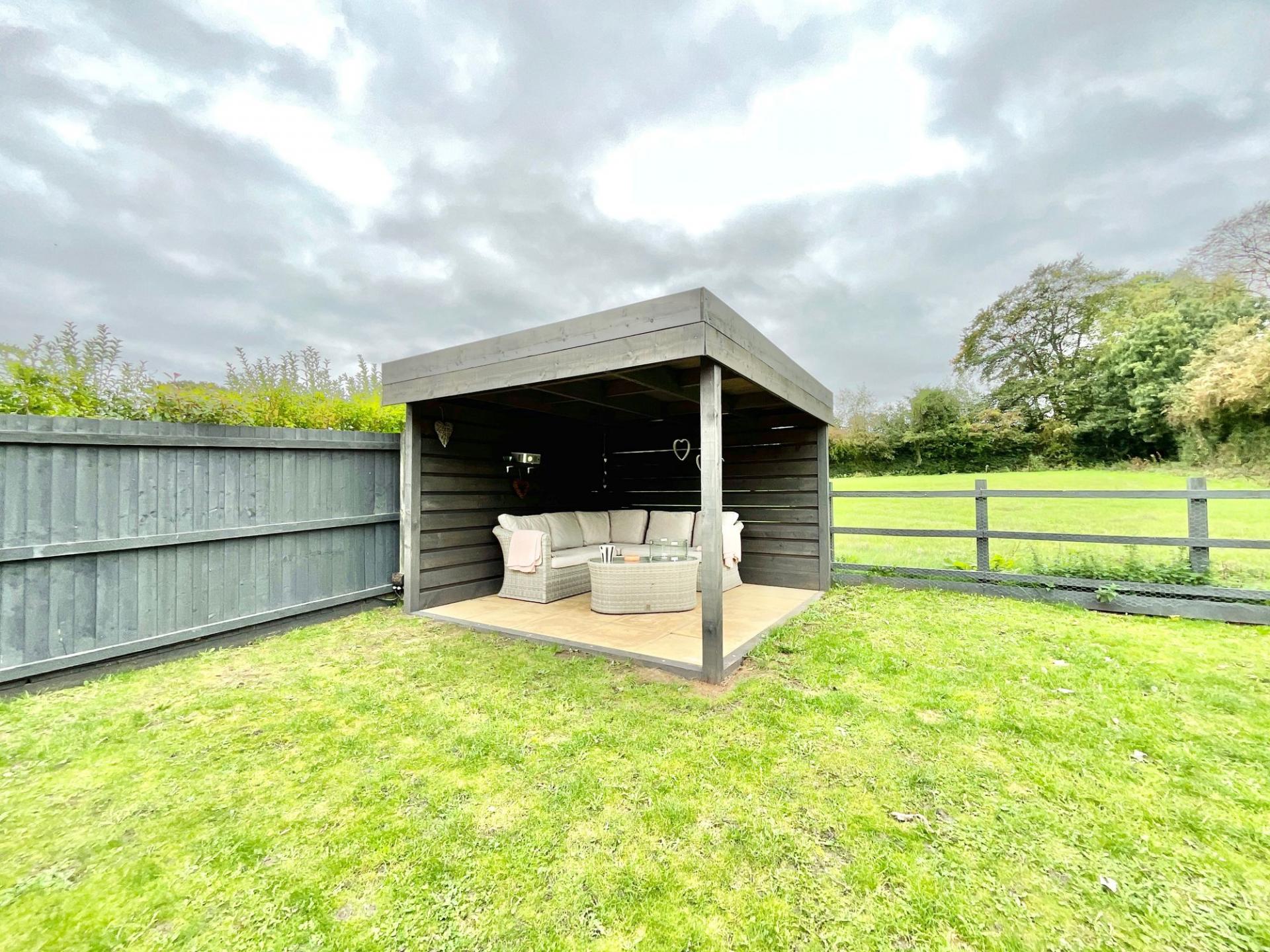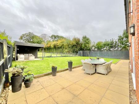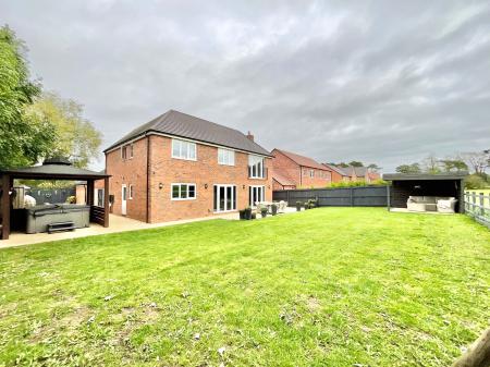 - Outside, enjoy a generous rear garden within the extended corner plot, showcasing multiple entertainment and seating areas, laid lawn and field views.