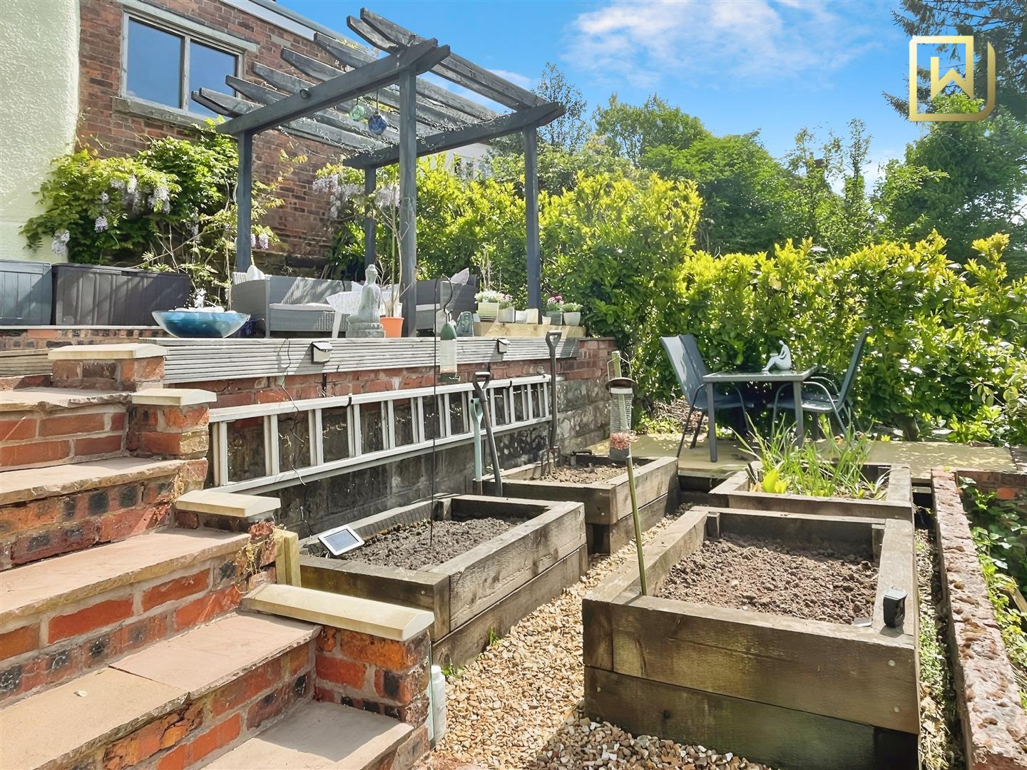 Externally the property continues to impress with a gorgeous tiered garden backing onto fields. Steps lead from a raised stone patio to a paved area and decking with pergola creating a lovely seating area. Beyond, is a spacious lawn with pond and space for shed to store gardening equipment. There is a parking space to the left of the property with further parking just a short walk away.