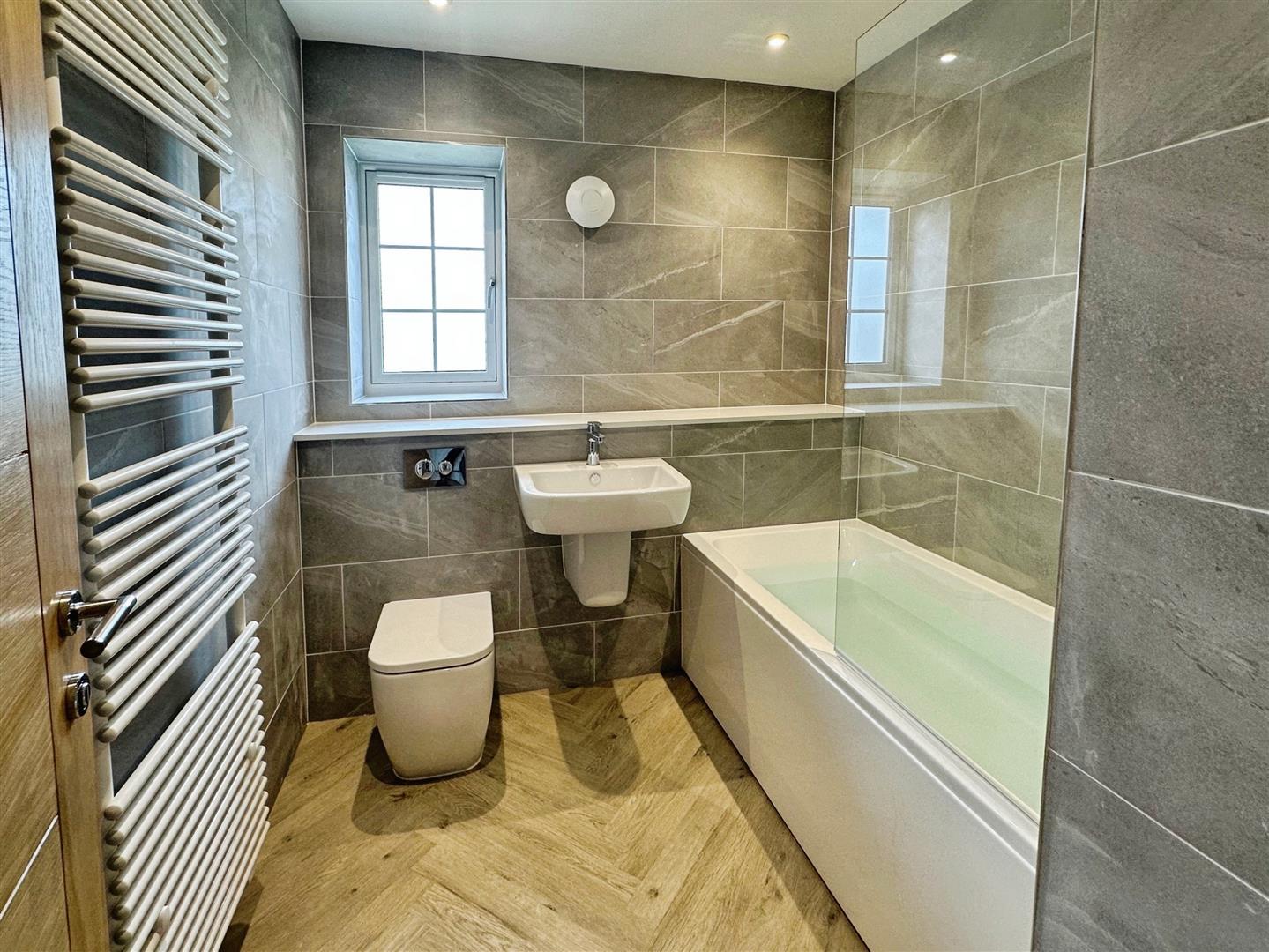 Family Bathroom - 2.15 x 2.17 (7'0" x 7'1") - Fitted with a suite comprising of panelled bath with shower over, back to wall WC and wall mounted wash hand basin. Herringbone style vinyl flooring. Fully tiled walls. Wall mounted heated towel rail. Obscured uPVC window to the rear aspect. Ceiling spotlights.