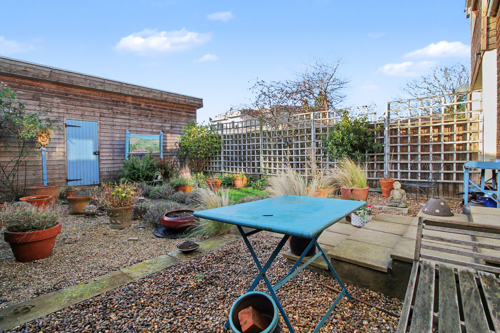 - Enjoying a low-maintenance, south-facing garden featuring gravelled areas, a lawn edge with mature shrubs and a designated seating area ideal for outdoor relaxation.