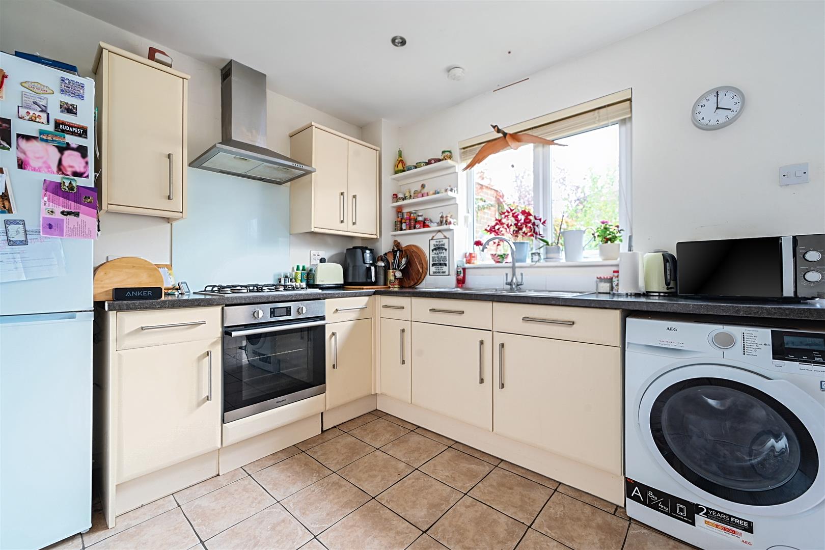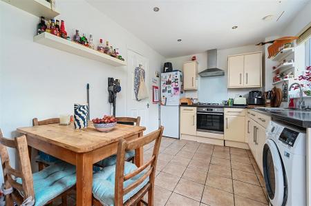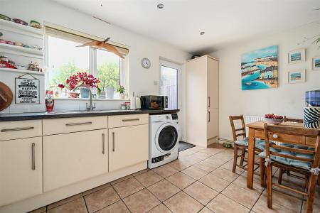 The property briefly consists of a bright lounge, which currently has space for an oversize sofa. This flows through to a tiled kitchen/breakfast room that offers counter space and storage on two sides, along with room for essential white goods and dining table. A rear door leads out to the patio area of the garden.