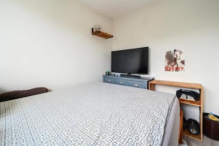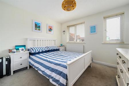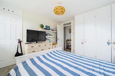 Stairs rise to the first floor, where you'll find both double bedrooms. The main bedroom is a sizeable 14' x 11'6" and includes built-in storage cupboards. The upstairs also features a fully tiled bathroom suite with matching white sanitary ware.