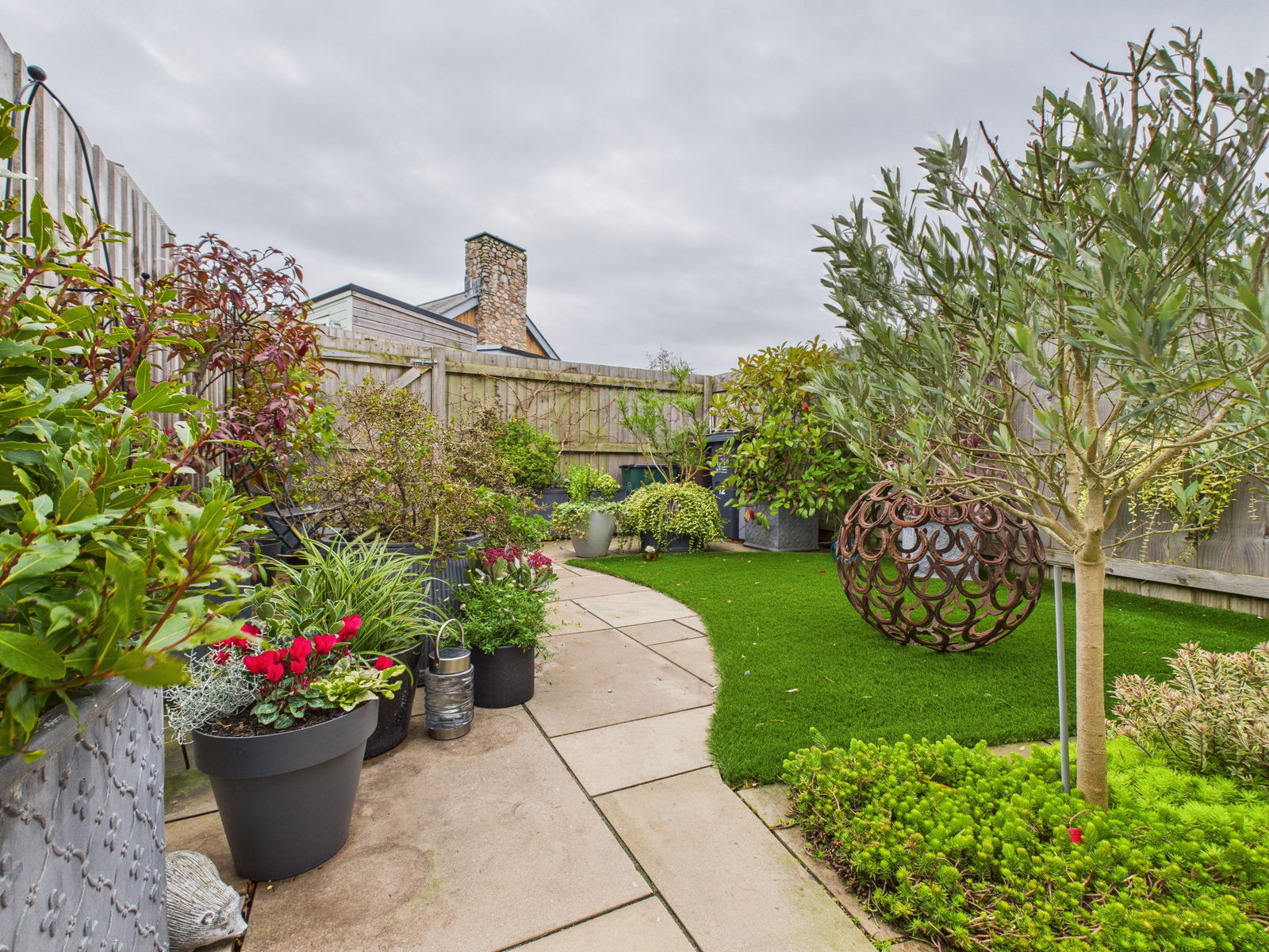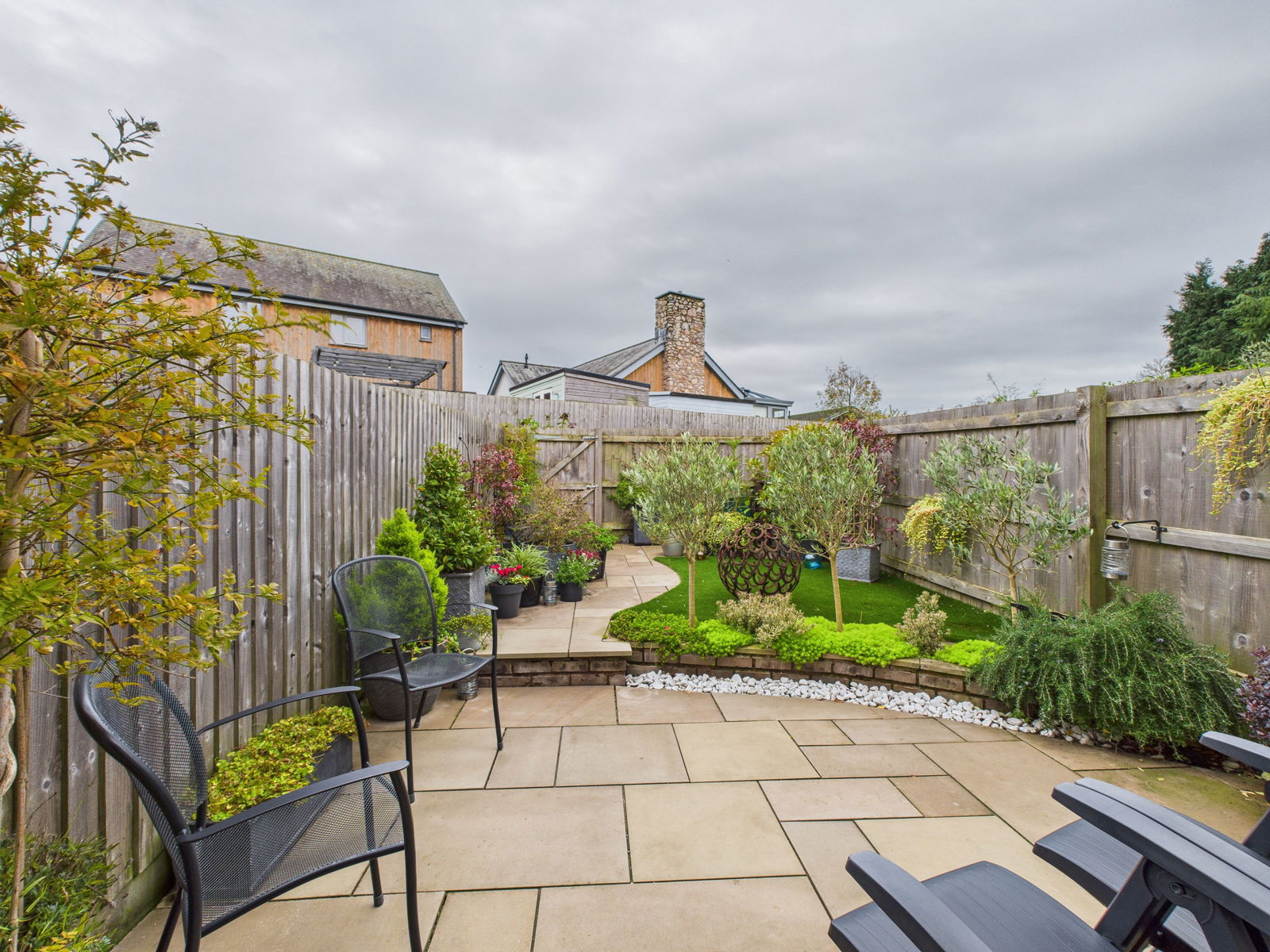 REAR GARDEN The beautifully landscaped south facing rear garden has been thoughtfully designed by the current owners featuring a patio area accessed from the kitchen/diner, perfect for alfresco dining and relaxation. A step leads up to a neatly maintained artificial lawn bordered by mature shrubs and plants, creating a peaceful and private outdoor space.