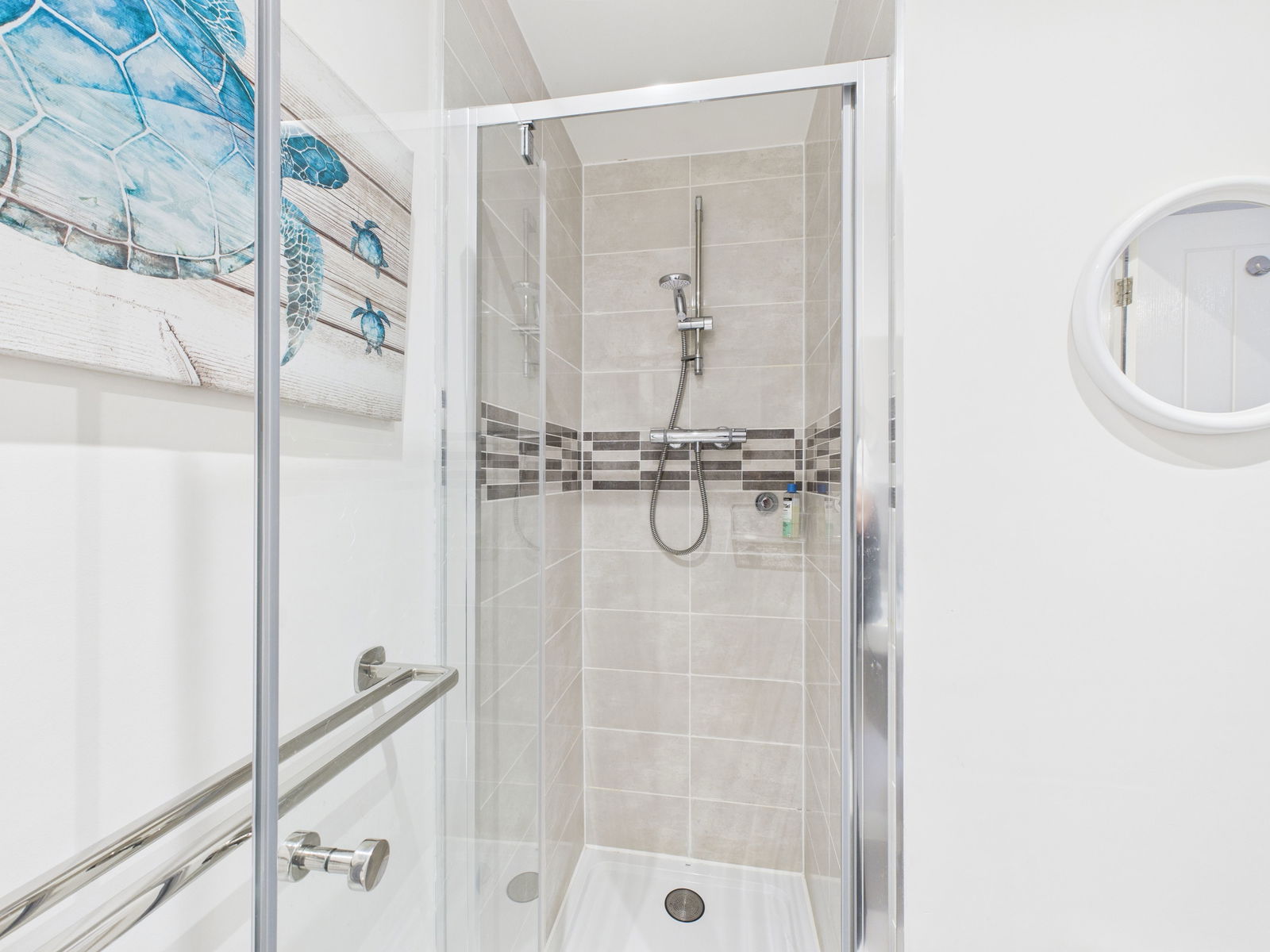 EN-SUITE  A modern and well appointed en-suite comprising a low level WC, wall mounted wash hand basin, and a walk in shower. Finished with complementary tiling, extractor fan, and a gas central heated radiator.