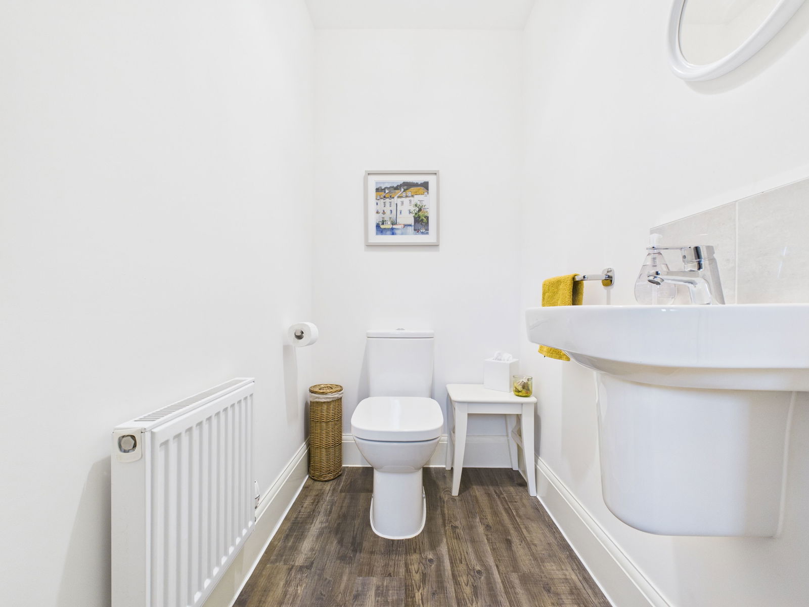 CLOAKROOM A practical downstairs cloakroom fitted with a low level WC and wall mounted wash hand basin. Complete with a gas central heated radiator and extractor fan.