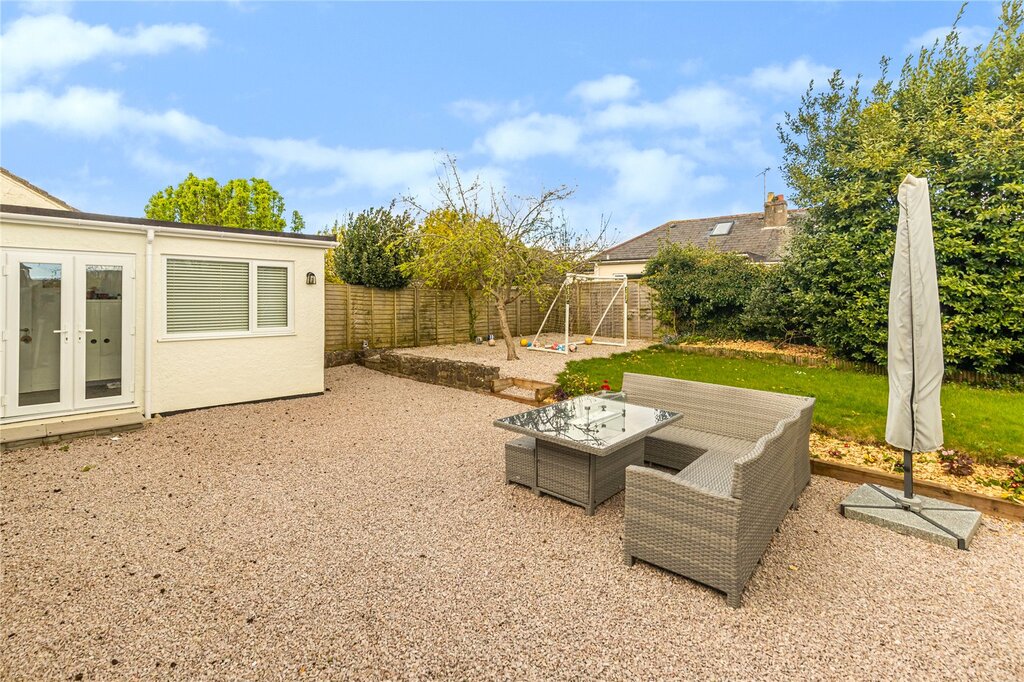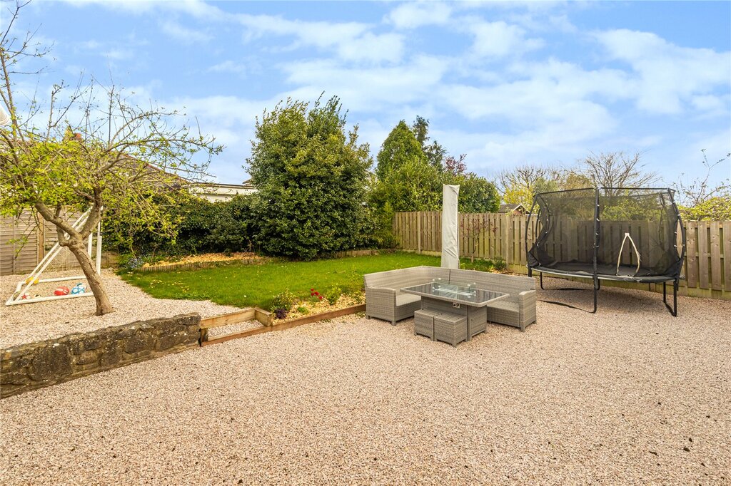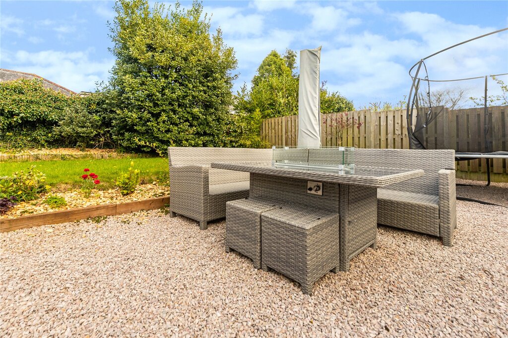 Outside the garden enjoys a large gravel patio area and a lawned area with shrub and flower boarders.