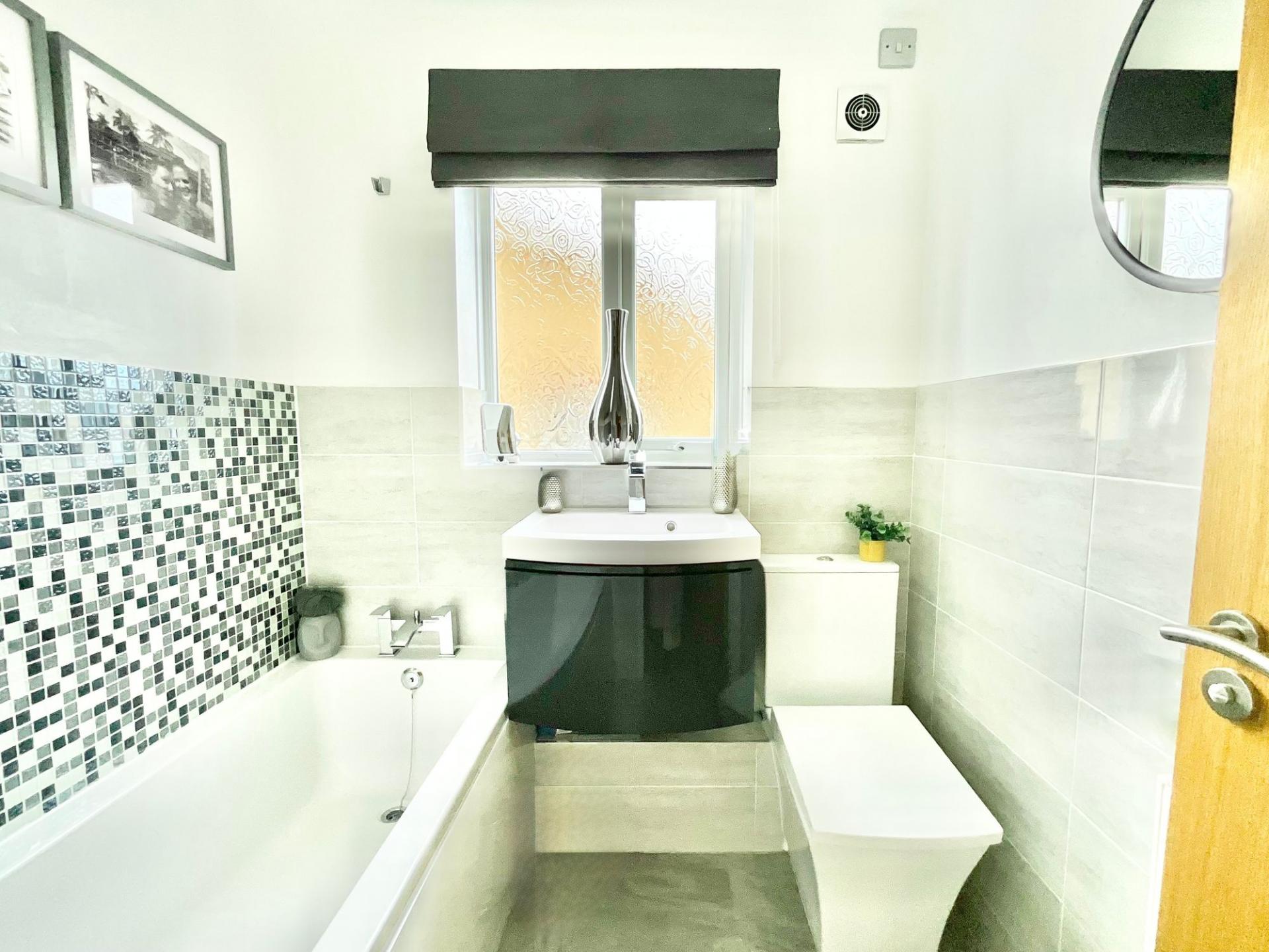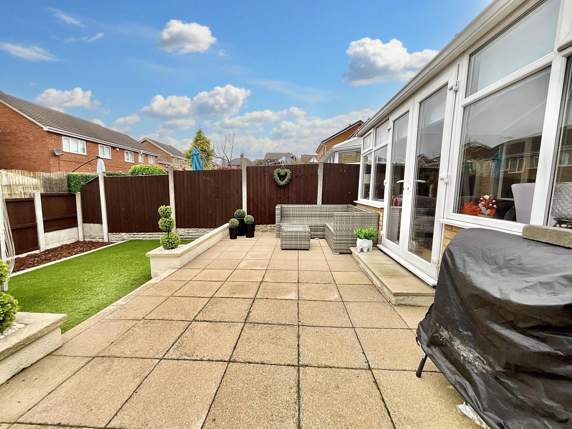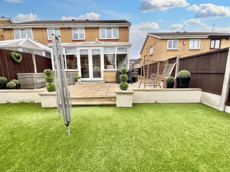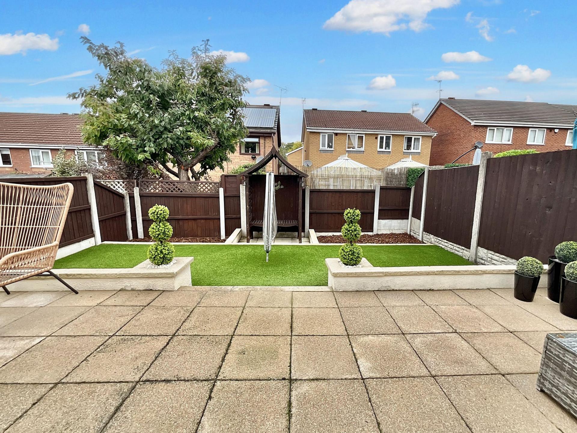 - The rear garden is fully fenced and multi-layered, with an artificial lawn and patio seating area ideal for relaxing or entertaining.