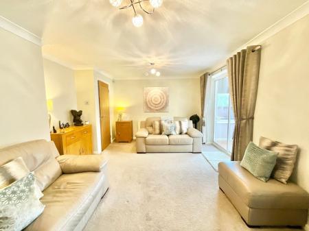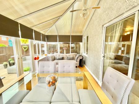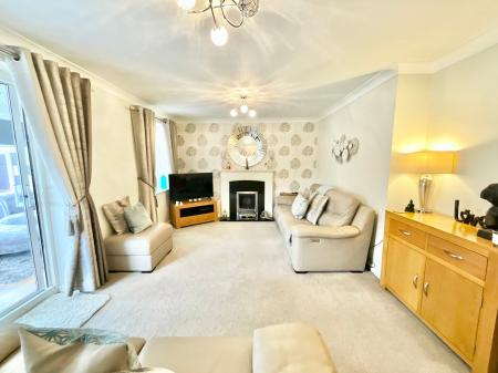 - The lounge, spacious yet cosy, complete with an inviting fire surround. Sliding glazed doors open into the conservatory, a bright and airy space where natural light floods in.