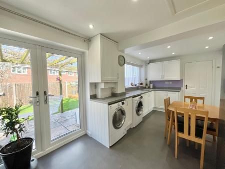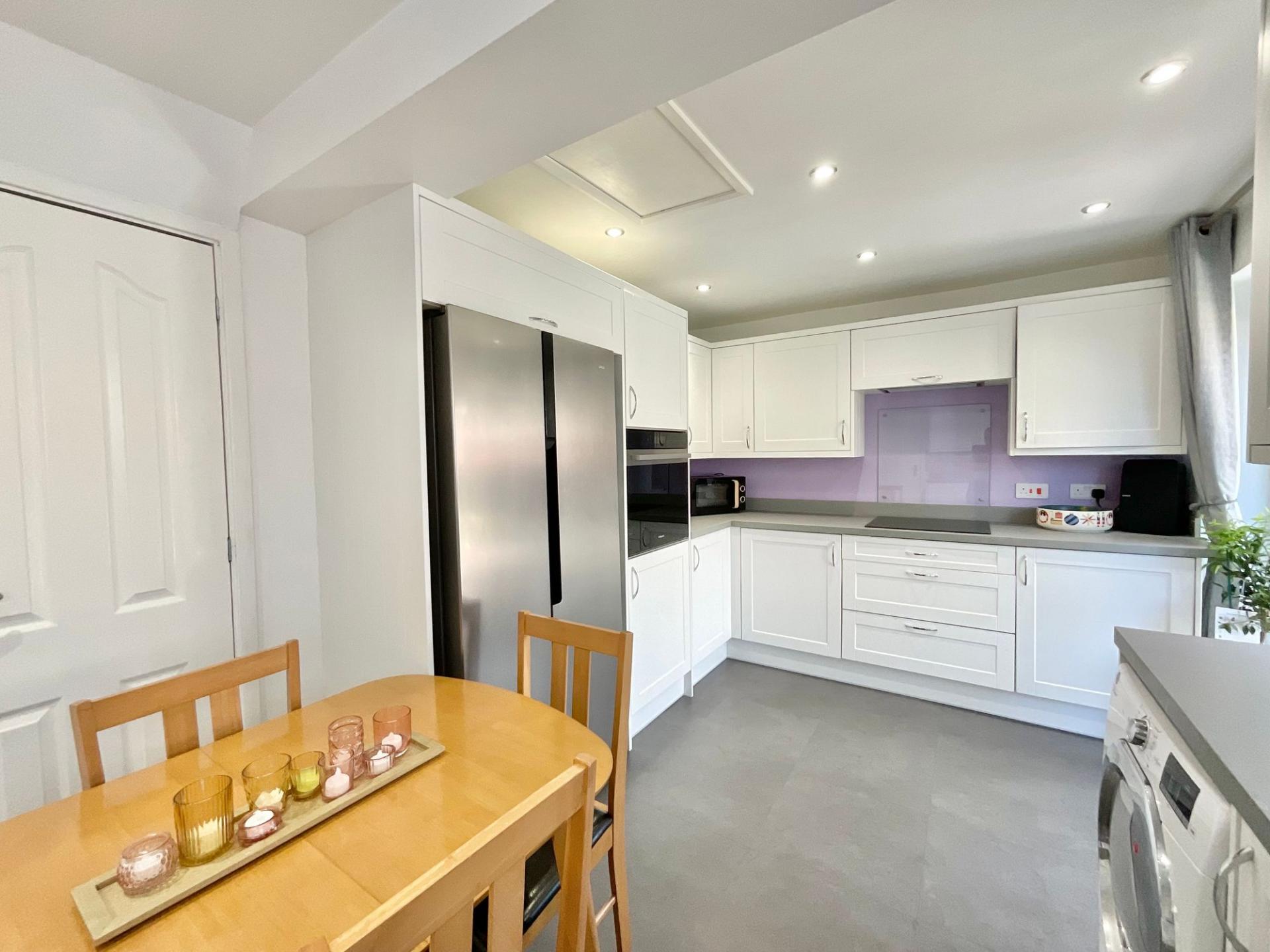• Spacious kitchen/diner with shaker-style units, ample appliance space, and French doors opening onto the garden. Bright living room featuring a bay window, cosy fire surround, and French doors.