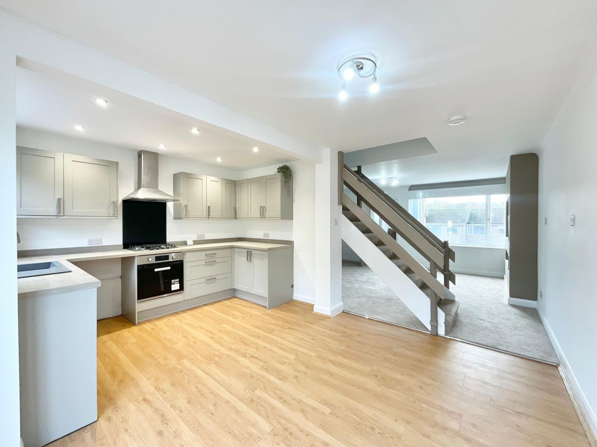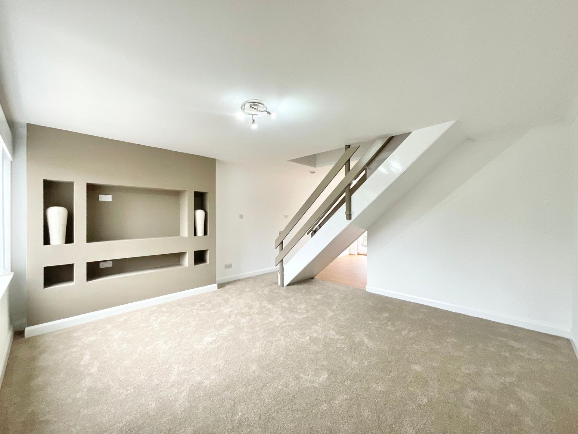 - Living room with modern media wall that continues into open-plan kitchen/diner. Practical U-shaped kitchen with stylish beige cabinetry and plenty of room for appliances.
