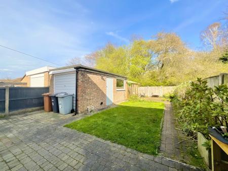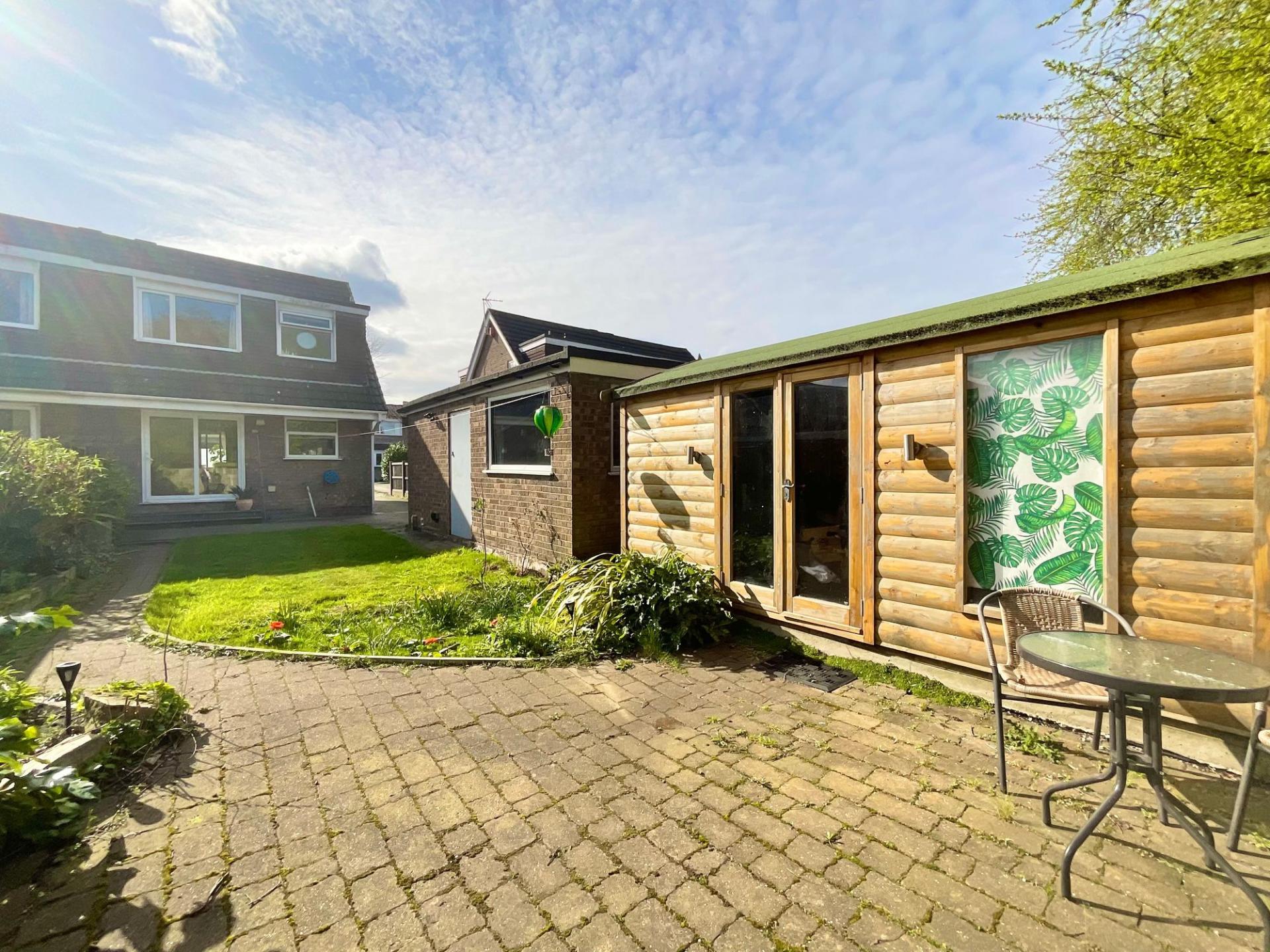 - Private rear garden with lawn and patio seating areas, plus garage, versatile outbuilding with potential, and driveway parking for multiple cars.