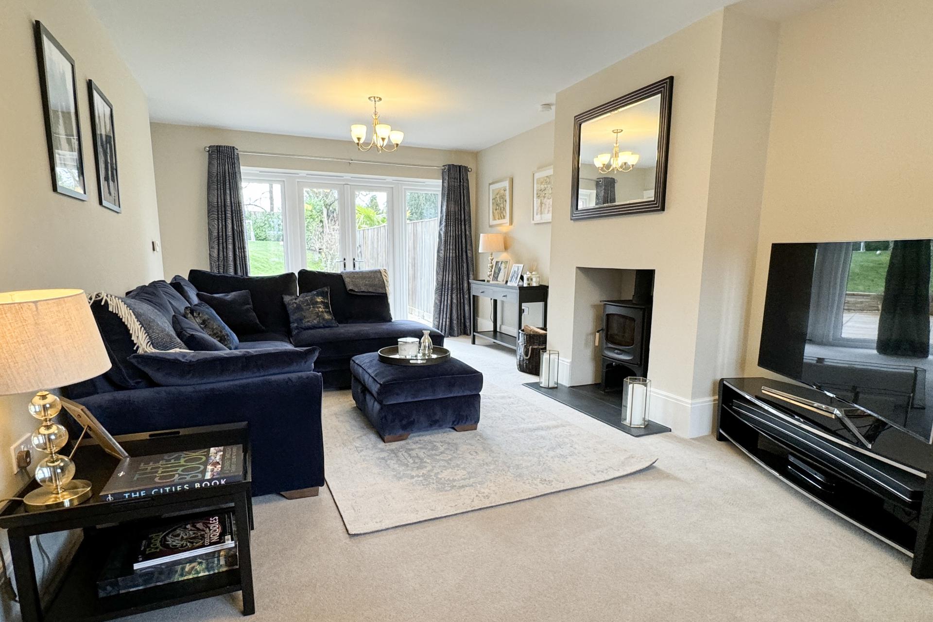 On the right is a double aspect living room with a log burner and double doors opening up on to the garden.