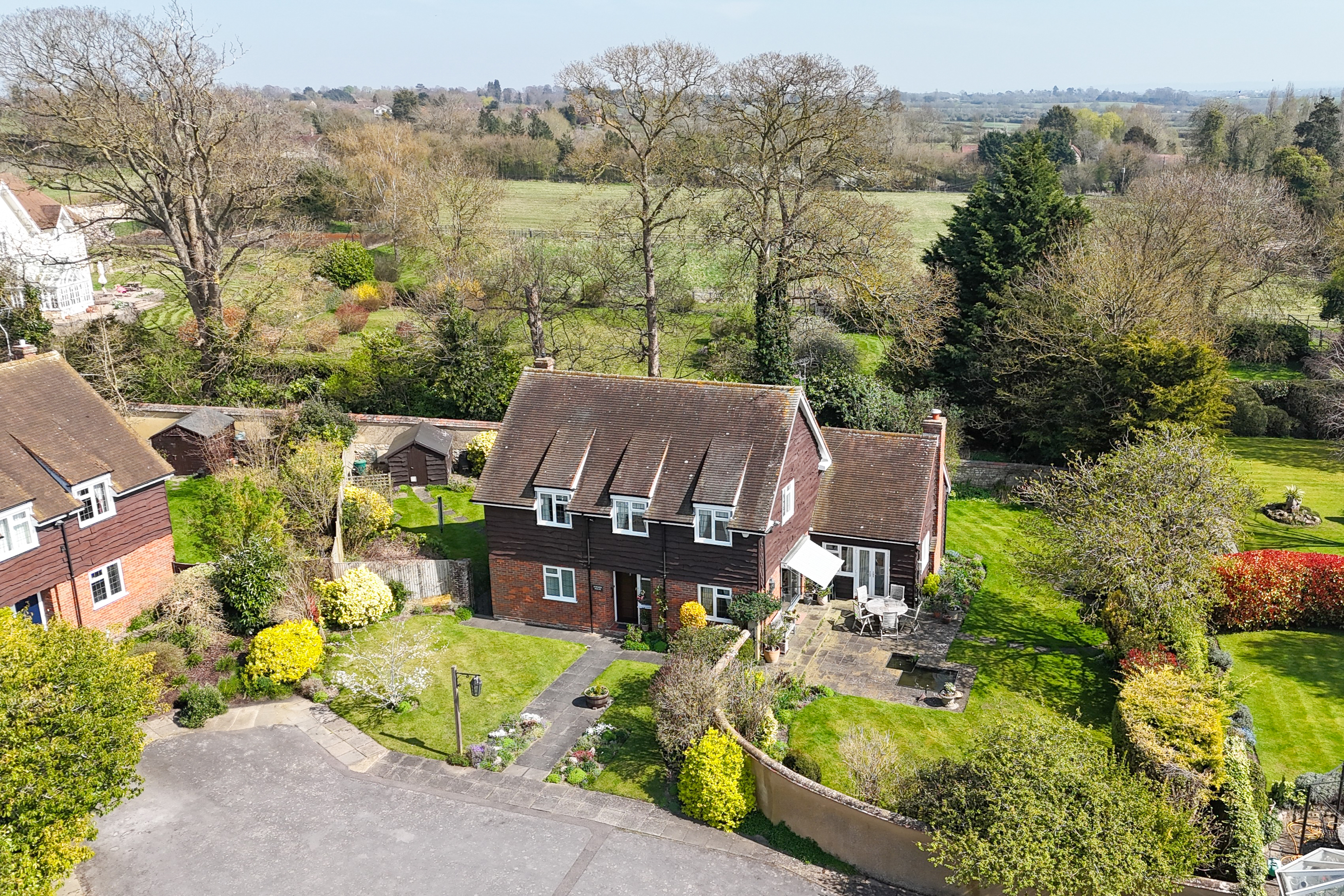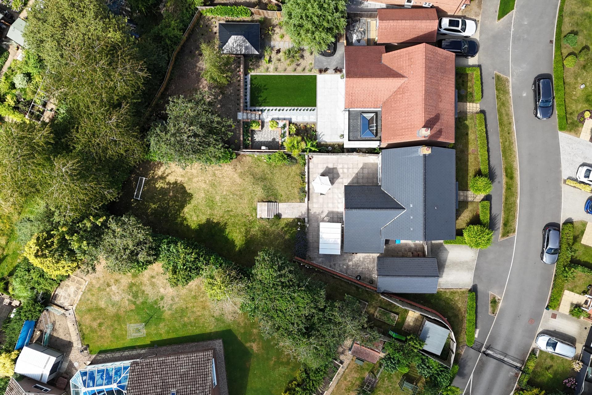 The house is situated in a quiet and private development of just 11 houses. Towards the front of the house is parking for two vehicles and a detached garage.