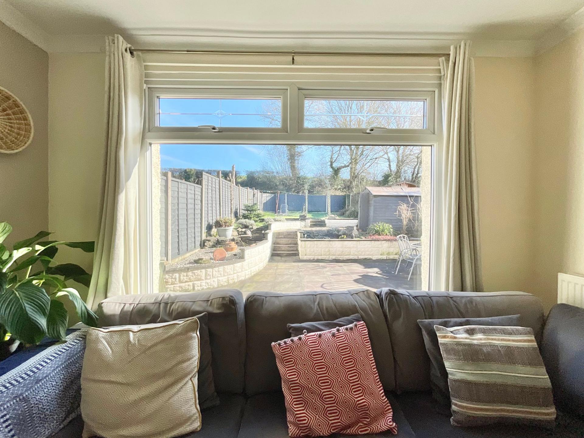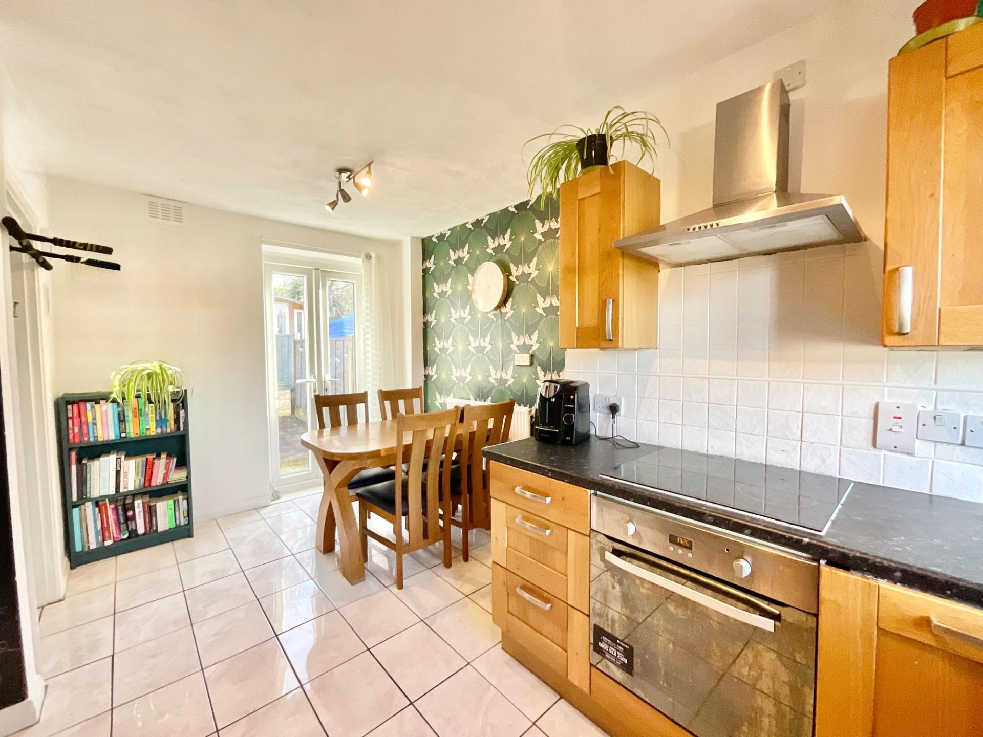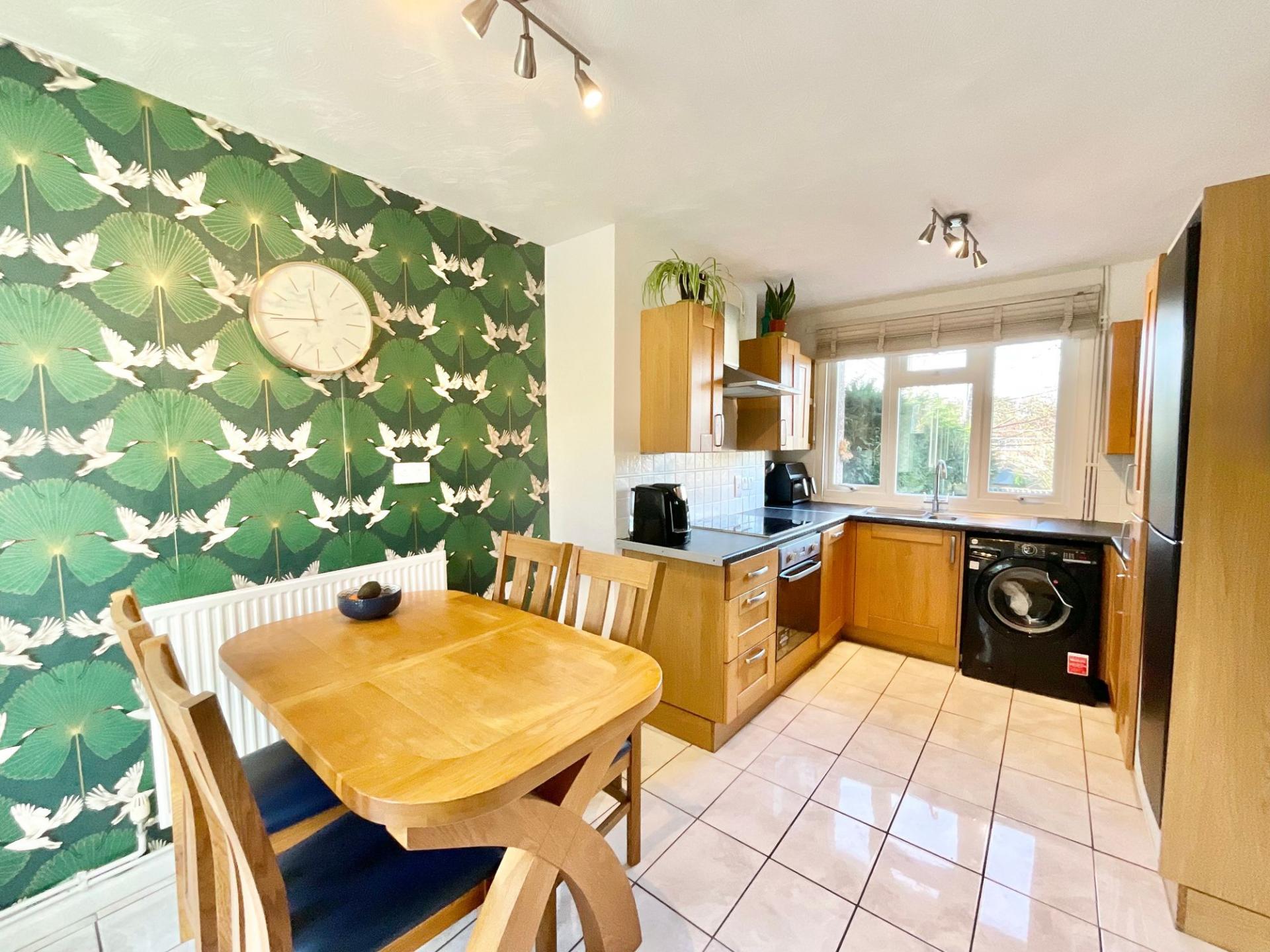 - Bright living room with feature fire surround and picture window overlooking the rear garden, open-plan kitchen/dining room with U-shaped kitchen, room for appliances, and glazed French doors.